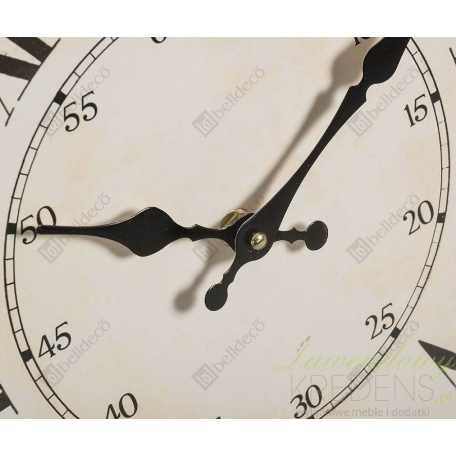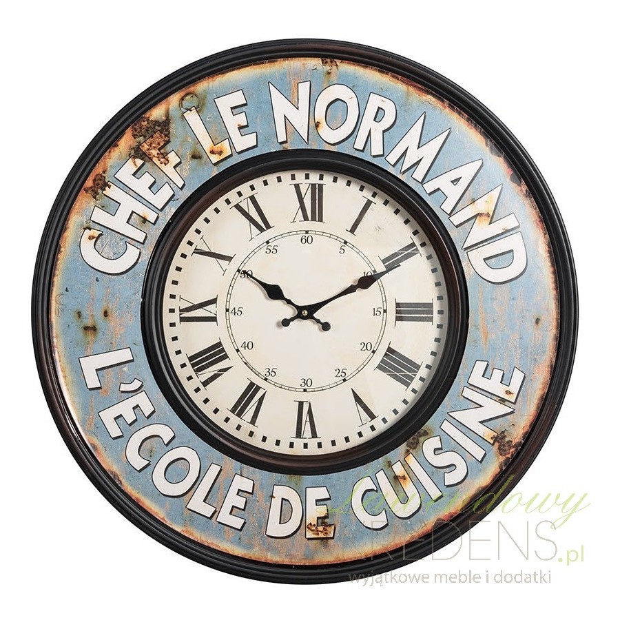Oryginalne zegary ścienne, jako zegary Belldeco odznaczają się niepowtarzalnym klimatem i duchem. Na metalowej ramie, w śroku której znajduje się tarcza zegara, na niebieskim tle widoczne są białe napisy w języku francuskim. Cała powierzchnia ozdobna jest specjalnie postarzana zadrapaniami, zardzewieniami, co przyciaga wzrok. Sama tarcza z wyraźnymi rzymskimi cyframi i specjalną podziałką minutową jest dobrze widoczna i elegancko wyeksponowana!