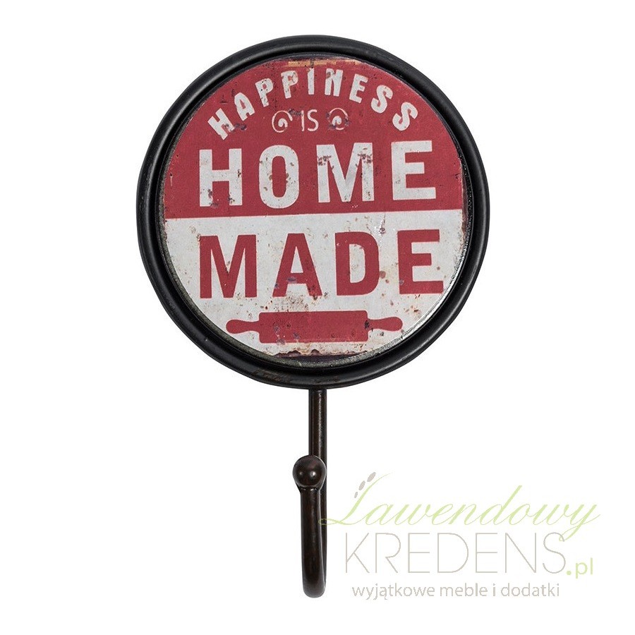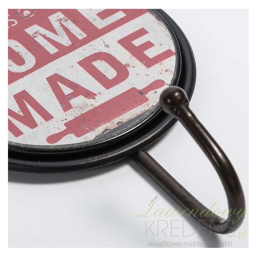 W całości wykonane z metalu wieszaki ścienne Belldeco, które świetnie sprawdzają się jako kuchenne dodatki w stylu retro. Charakterystycznym elementem wieszaka jest okrągła tabliczka z czarną krawędzią i biało-czerwoną grafiką z wałkiem i napisem w jęzuku angielskim mówiącym o domowym szczęściu.