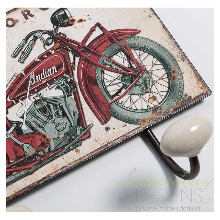 Podwójny wieszak retro marki Belldeco, zachwycający praktycznością i niezwykłą grafiką. Dwa metalowe uchwyty zakończone ceramicznymi kulkami, mają za zadanie ochronę materialu przez zniszczeniem. Tabliczka dekoracyjna, będąca wyróżnikiem tego wieszaka ozodbiona została pięknym rysunkiem dużego, czerwonego motocykla. Powierzchnia tabliczki jest dodatkowo postarzana, aby styl retro był jeszcze bardziej widoczny!