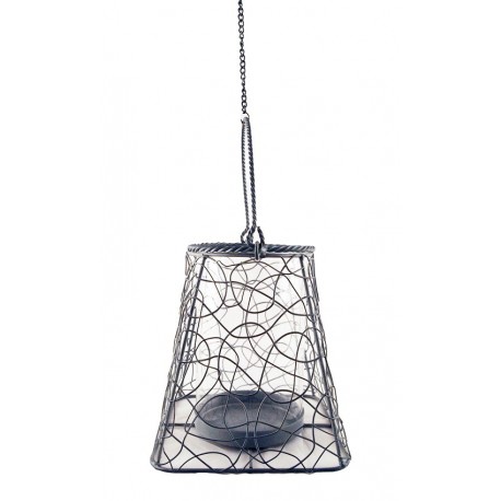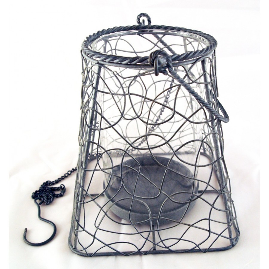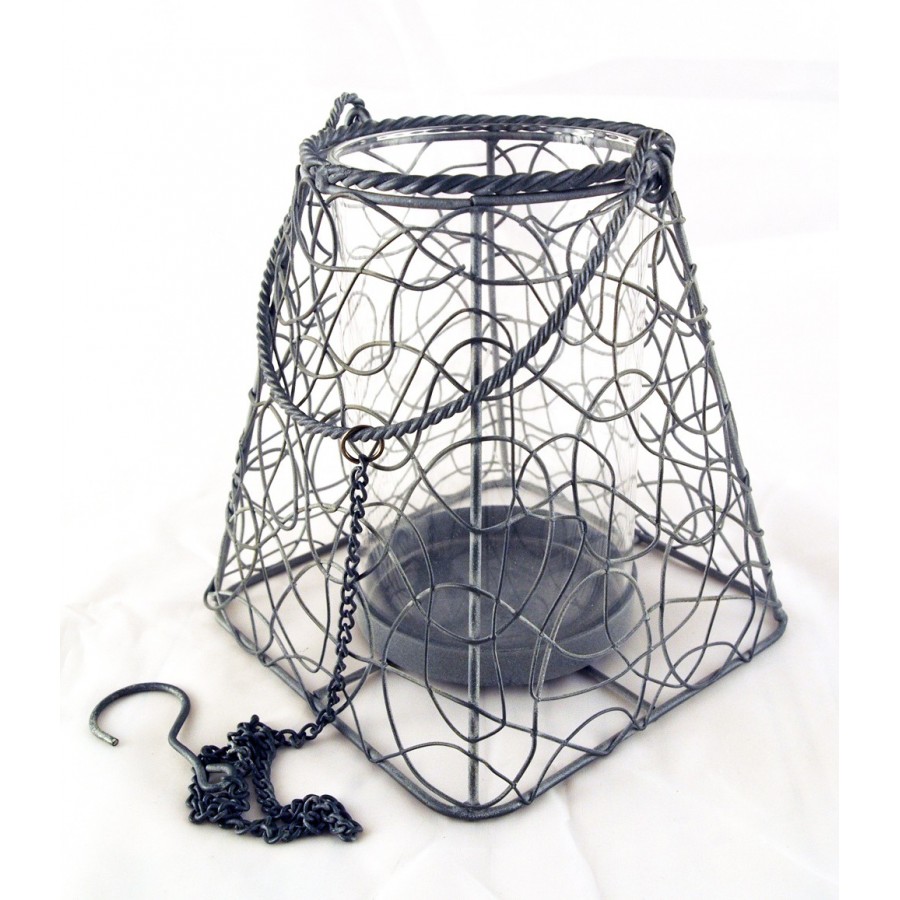 Lampion szary wykonany w stylu prowansalskim o pięknym zdobieniu stworzonym z plątaniny ładnie ułożonych drucików to wyjątkowa propozycja o gustownym wyglądzie. Wewnątrz lampionu umieszczono szklane naczynie oraz podest na świeczkę. Całość zawieszono na ładnym, szarym łańcuszku zakończonym haczykiem.