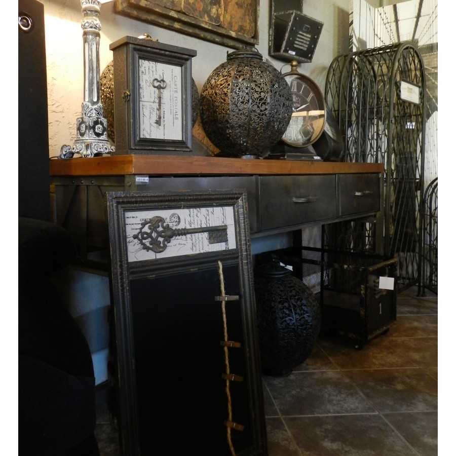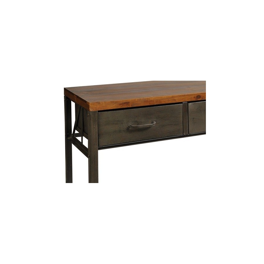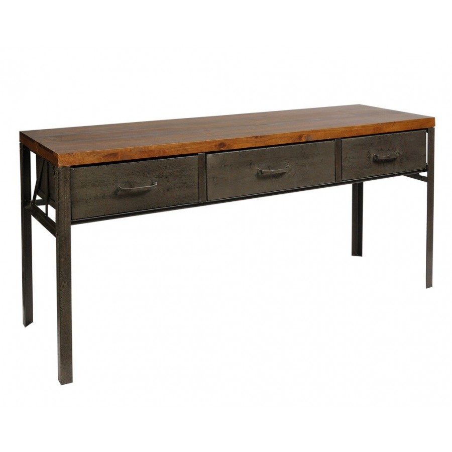 Ciekawy Stolik Rustic z trzema szufladami firmy Belldeco, którego podstawa oraz szuflady wykonane są z metalu, a blat z drewna sosnowego.