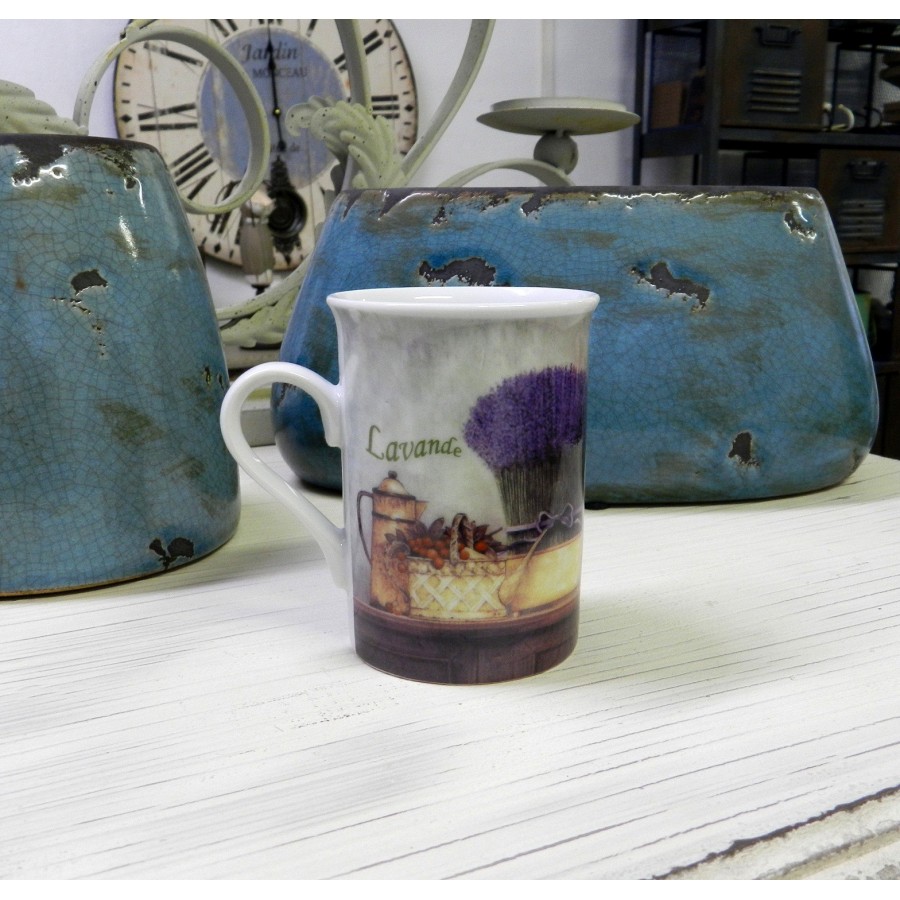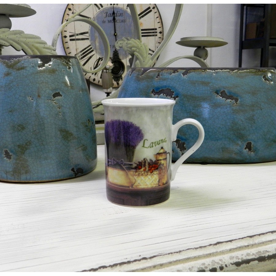 Ceramiczne kubki w stylu prowansalskim z przepięknym wzorem bukietu suszonych kwiatów lawendy. Oprócz lawendy na prowansalskich kubkach znajduje się dzbanek, konewka oraz napis Lavande.