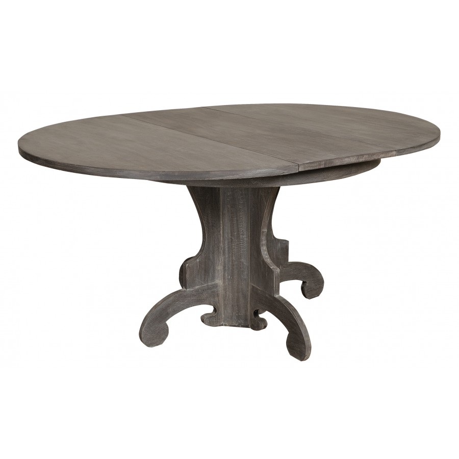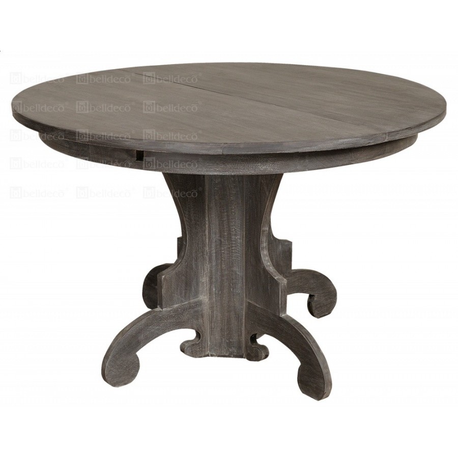 Ciekawy, rozkładany stół marki Belldeco na jednej nodze wykonany z litego drewna mangowca o średnicy 119cm. Po rozłożeniu natomiast długość stołu to 160cm i szerokość 119cm. Powierzchnia drewna jest celowo postarzana poprzez białe przetarcia. Na uwagę zasługuje także noga stołu Classic, która ma ciekawy, fantazyjny kształt.