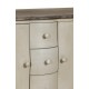 Grigio komoda Belldeco to bardzo ciekawy, pojemny mebel. Nóżki, fronty szuflady oraz uchwyty mają szary kolor, natomiast blat komody Belldeco ma ciemniejszy, naturalny kolor drewna. Oprócz półek, po środku szuflady znajdują się trzy małe szufladki.