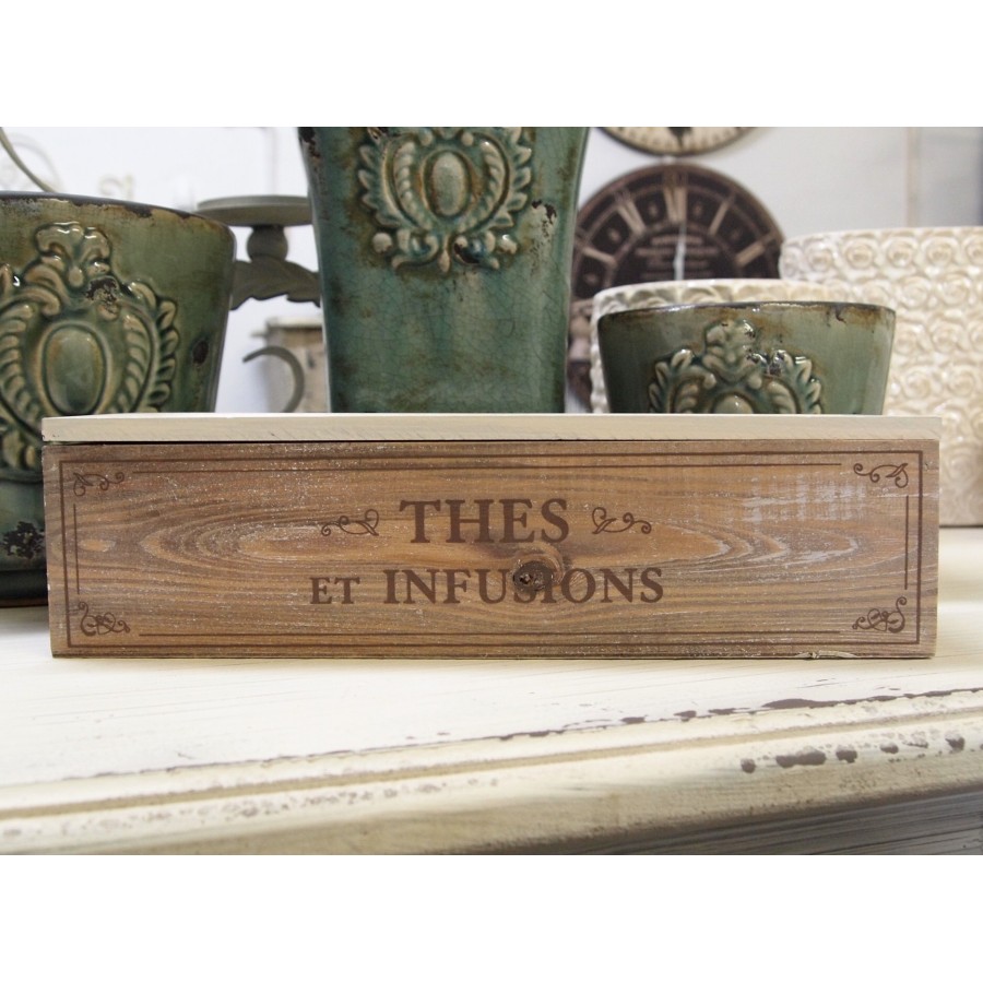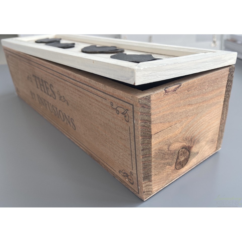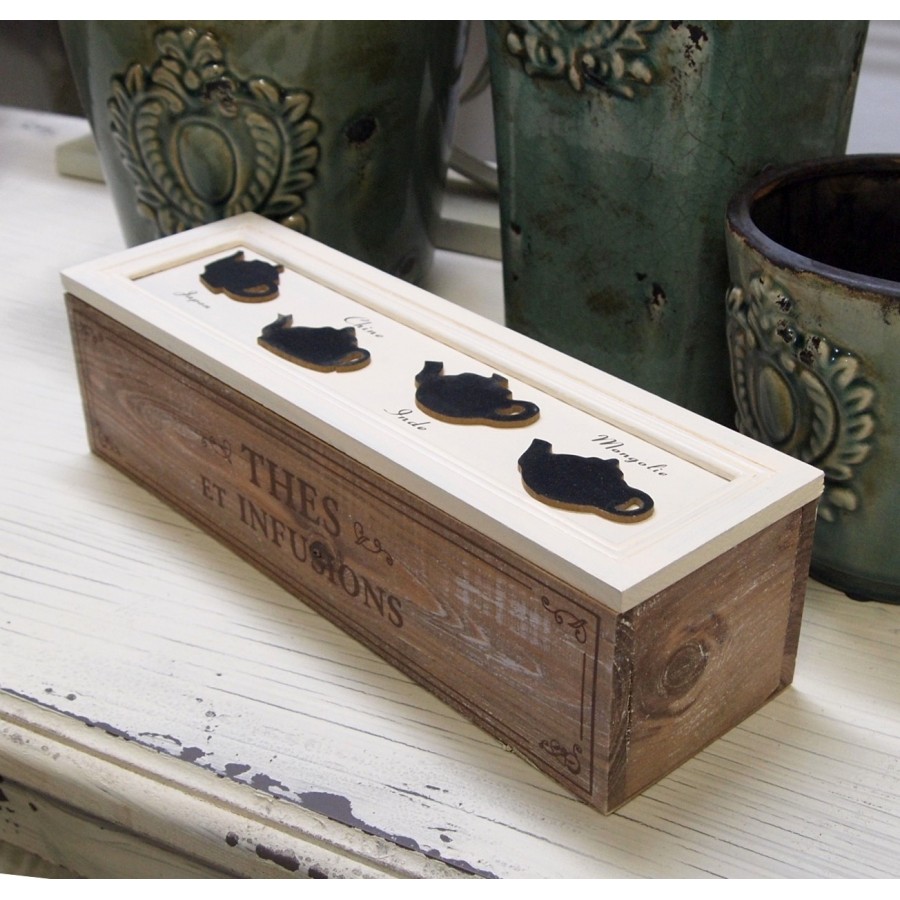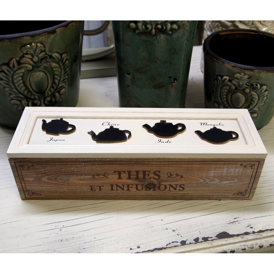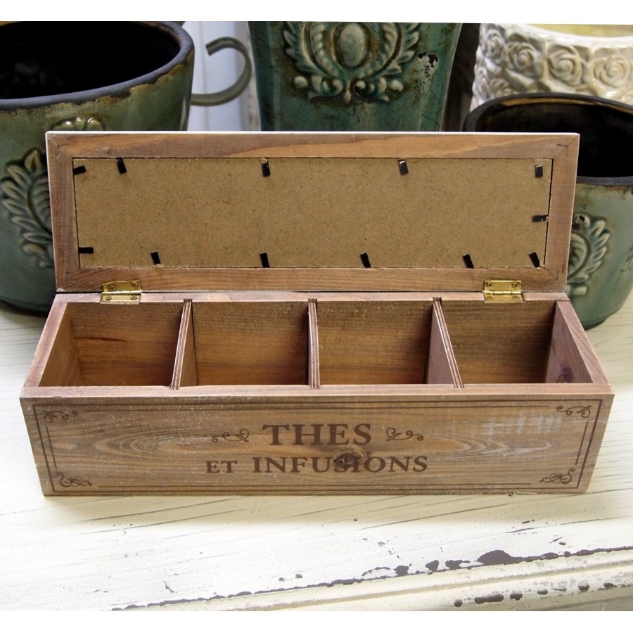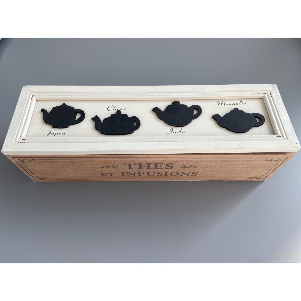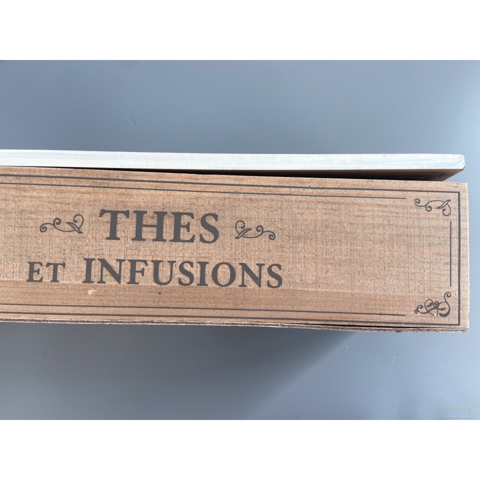 Drewniane, dwukolorowe pudełko na herbatę z czterema przegródkami. Na pudełku znajduje się ozdobny napis THES ET INFUSIONS.