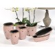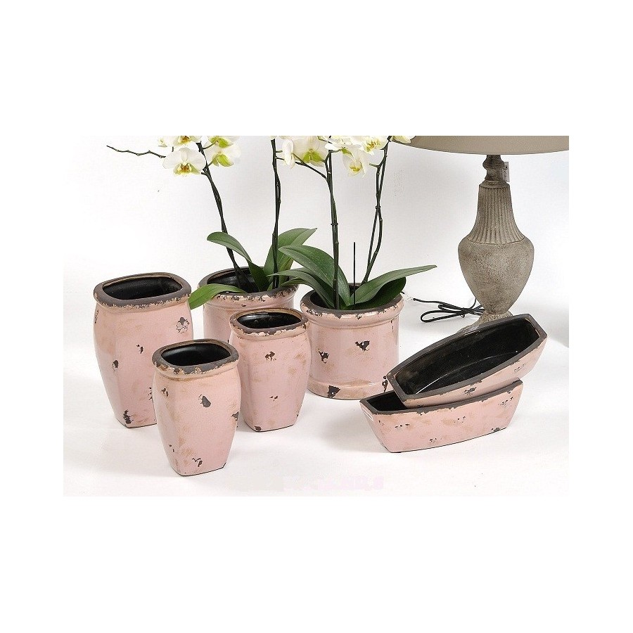 Różowe, nieprzeciętne doniczki Belldeco z nieregularnymi przecierkami i spękaniami w stylu shabby chic. Powierzchnia donic jest szkliwiona.