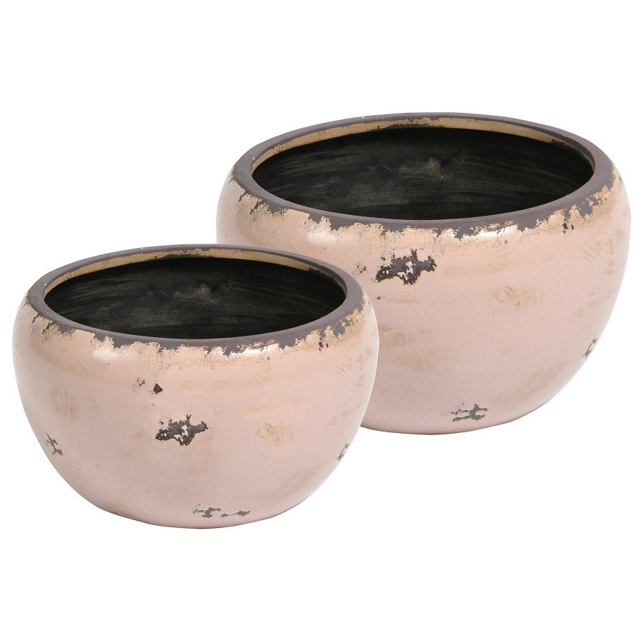 Szkliwione doniczki Belldeco o ciekawym, różowawym kolorze. Doniczki są oryginalnie stylizowane poprzez przecierki i spękania.
