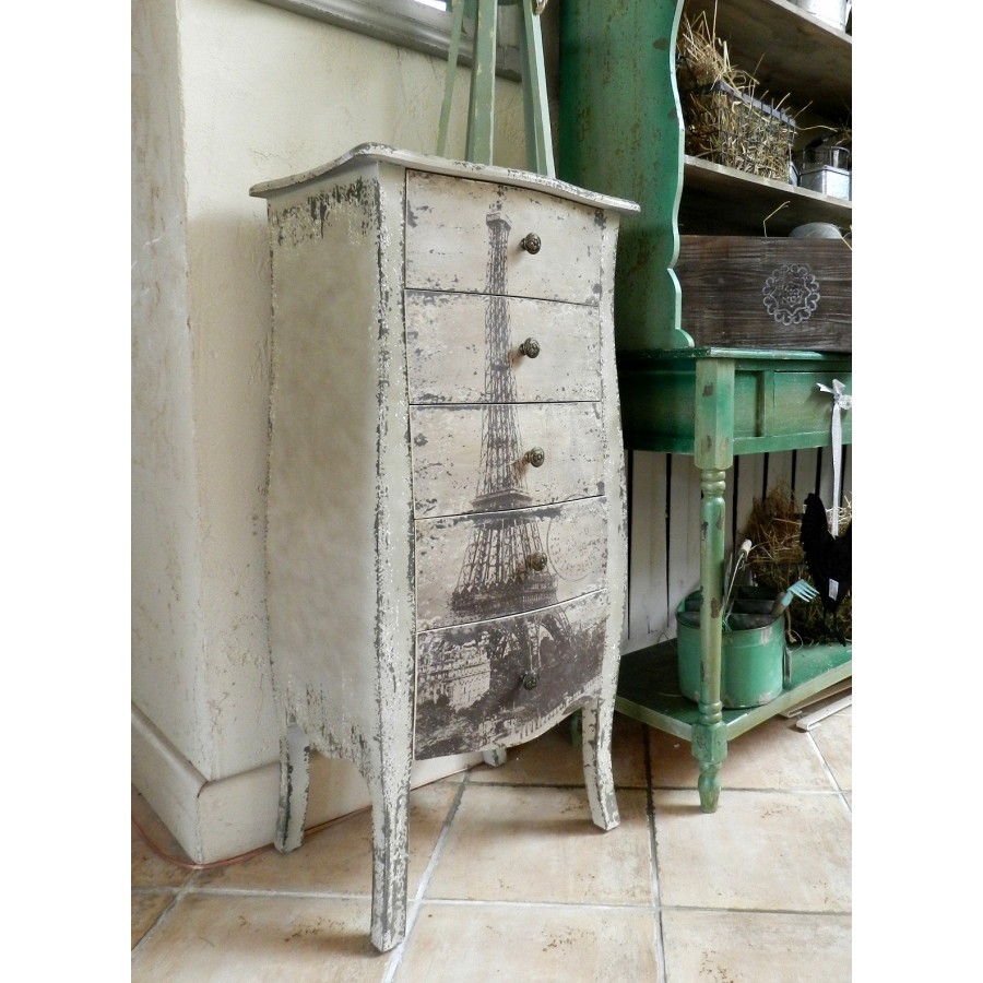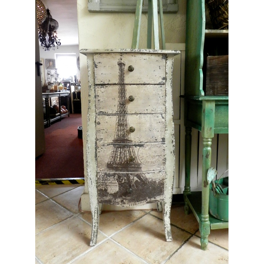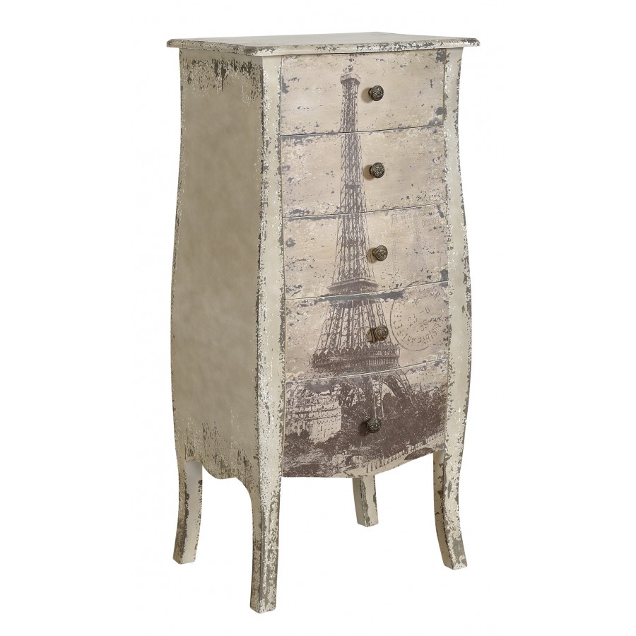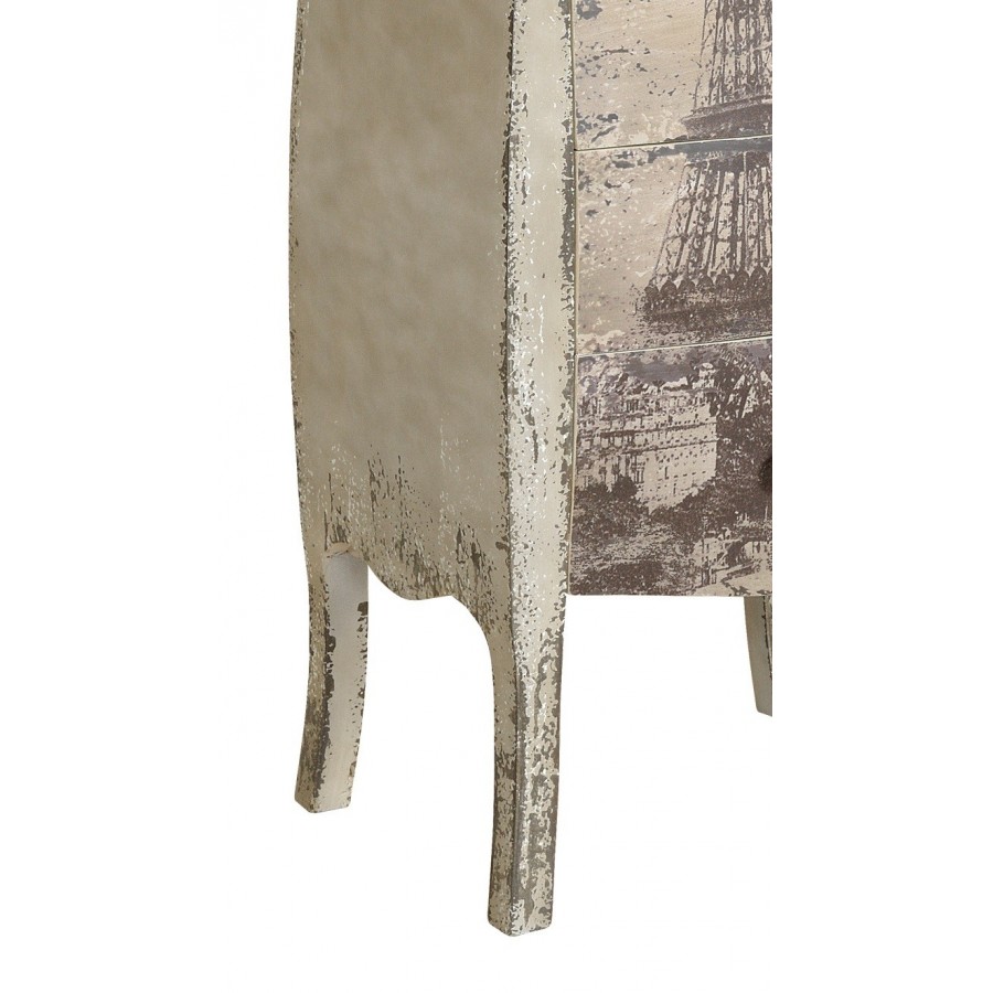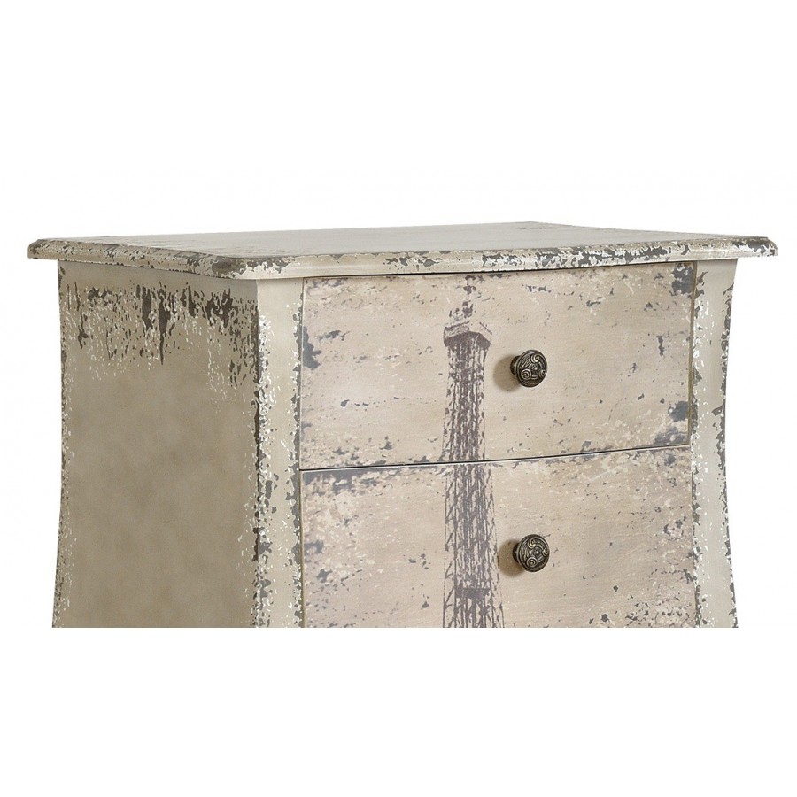 Oryginalna komoda Belldeco w stylu francuskim, z pięcioma szufladami. Komoda Grigio wykonana jest z drewna jodłowego oraz płyty MDF. Ma lekko chropowatą powierzchnię i jest postarzana poprzez liczne, nieregularne przecierki. Na froncie komody Grigio znajduje się nadruk z Wieżą Eiffla. Szuflady otwierają się na nieduże, metalowe, okrągłe uchwyty.