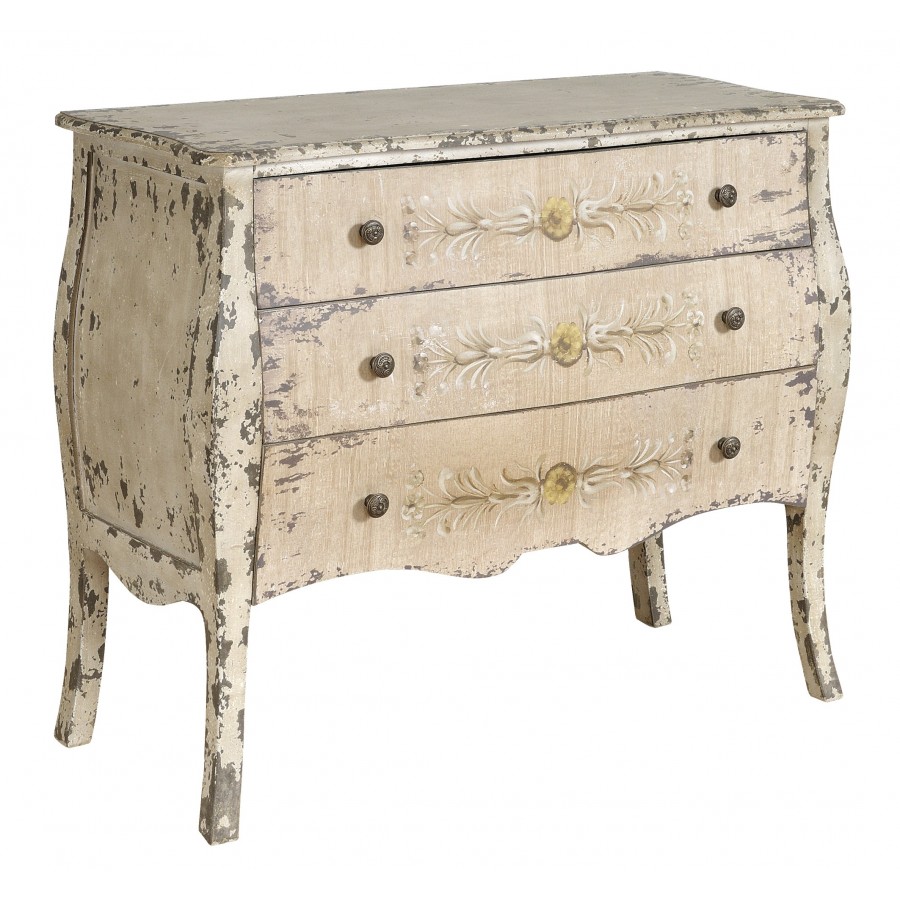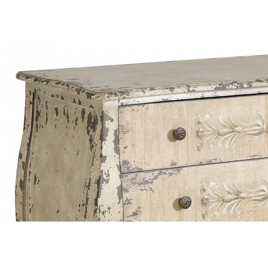 Szeroka komoda Belldeco z serii Grigio w stylu schabby chic z trzema szufladami. Każda szuflada otwierana jest dwoma małymi, metalowymi uchwytami. Komoda wykonana jest z drewna jodłowego i płyty MDF. Na froncie komody znajduje się kwiatowy dekor. Cała powierzchnia komody Grigio postarzana jest metodą shabby chic, na jej powierzchni znajduje się wiele nieregularnych przetarć farby. Elegancji dodaje komodzie jej stylowy, lekko zaokrąglony kształt.