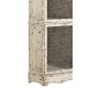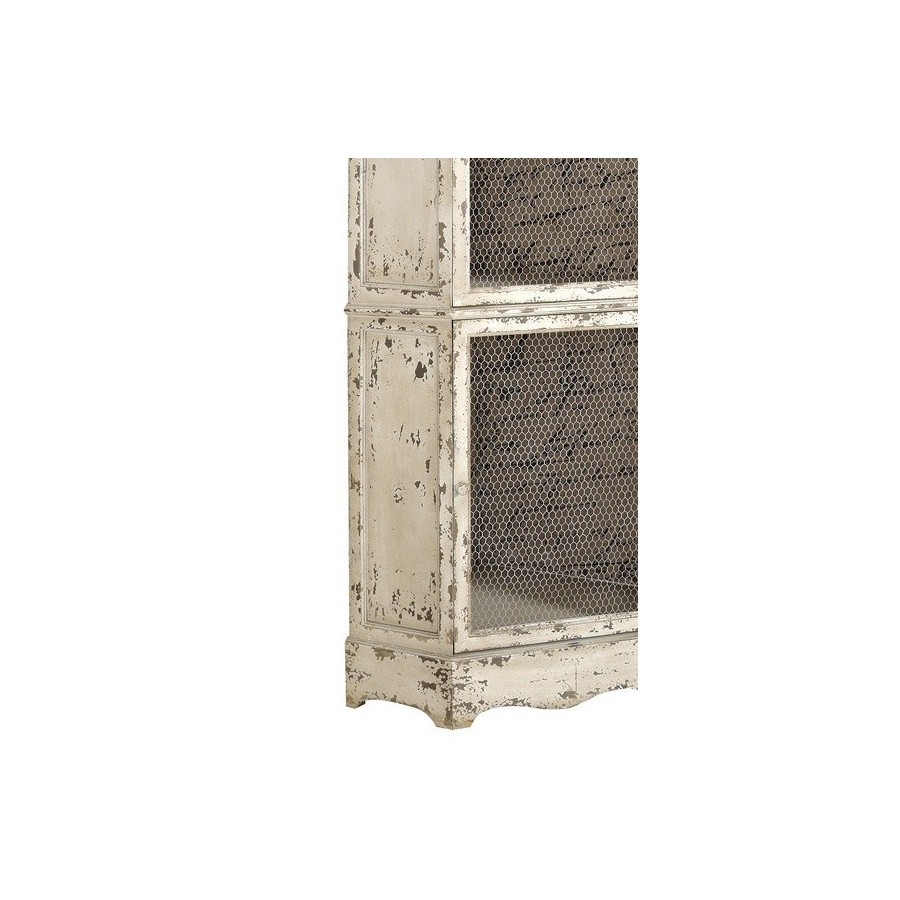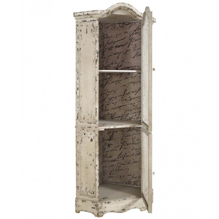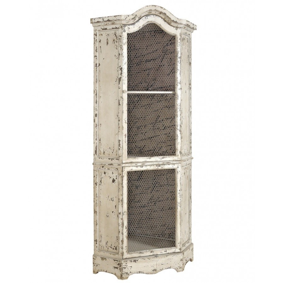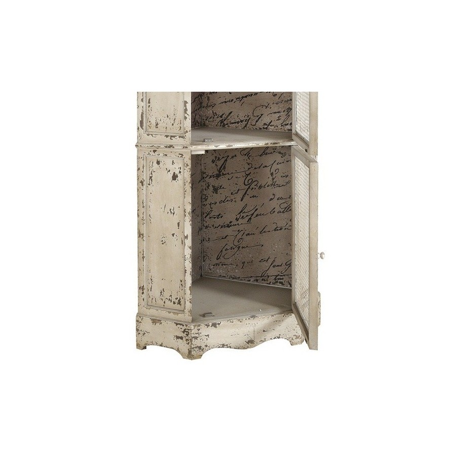 Szafa narożna Belldeco w stylu francuskim, wykonana z jodły oraz płyty MDF i postarzana metodą shabby chic. Drzwiczki zamiast szyby mają metalową siatkę.