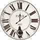 Stylowy, duży zegar Belldeco w stylu prowansalskim z napisem Paris. W dolnej części zegara znajduje się ozdobne, metalowe wahadło.