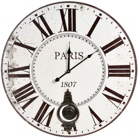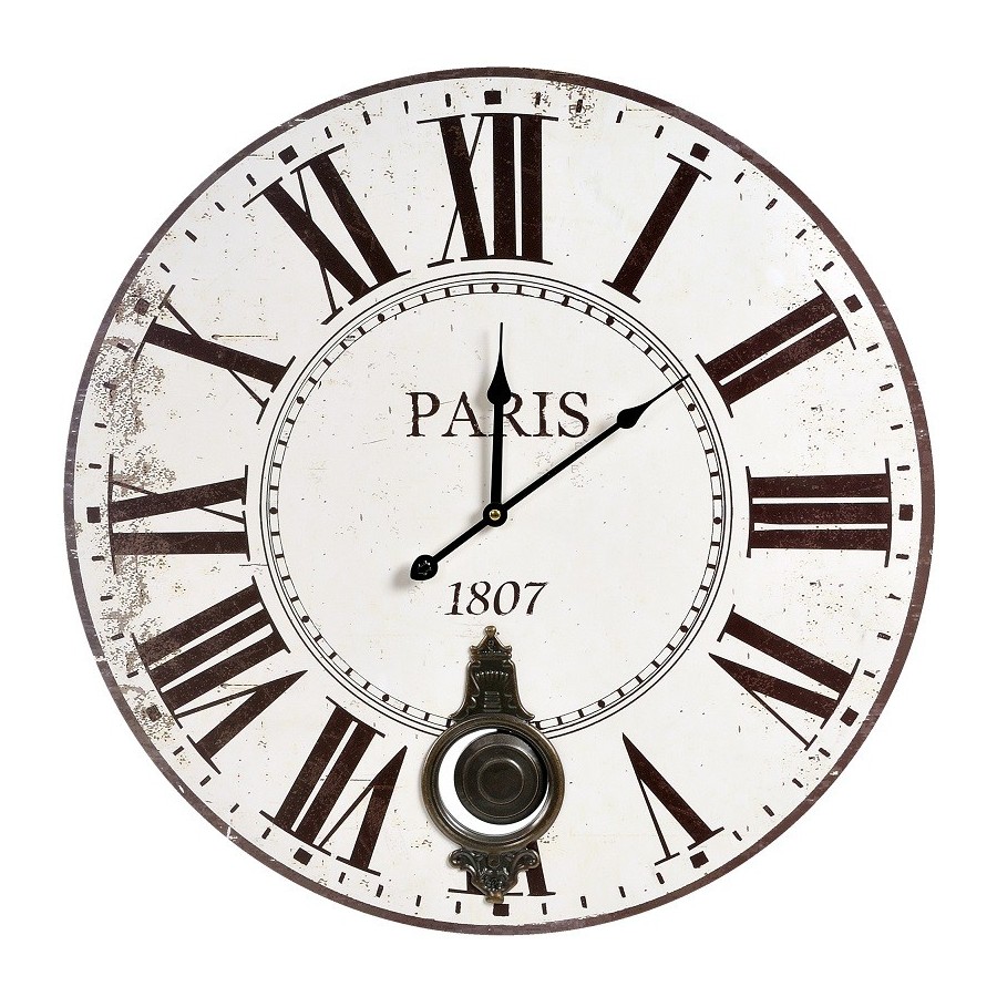 Przepiękny, duży zegar ścienny Paris marki Belldeco w stylu prowansalskim. Tarcza zegara jest w kolorze kości słoniowej, znajdujące się na niej godziny zapisane są cyframi rzymskimi. Na środku tarczy znajduje się stylowy napis Paris 1807. Wskazówki oraz ozdobne wahadło zegara Paris wykonane są z metalu. Na zegarze znajdują się szre przecierki w stylu shabby chic, dzięki którym zegar wygląda bardzo efektownie.