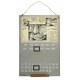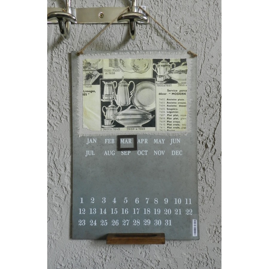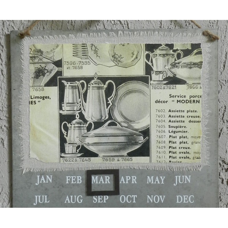 Kalendarz Belldeco wykonany z metalu, ozdobiony kawałkiem płótna z nadrukiem, na którym znajdują się starodawne zdjęcia zastawy stołowej.