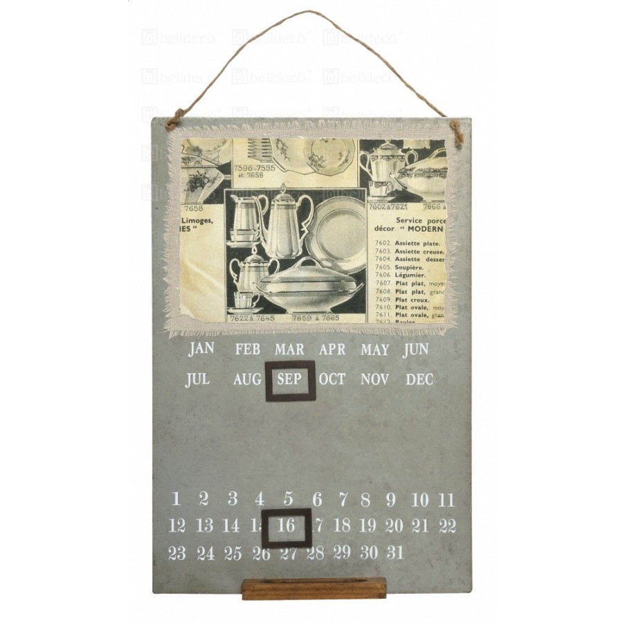 Metalowy kalendarz ścienny Belldeco w stylu prowansalskim z serii Vintage. Na kalendarzu znajdują się zapisane na biało miesiące oraz dni miesiąca, które można zaznaczać za pomocą czarnych , magnetycznych ramek w kształcie prostokątów. W górnej części kalendarza znajduje się uroczo postrzępione, beżowe płótno ozdobione nadrukiem ze starodawnymi zdjęciami zastawy stołowej.