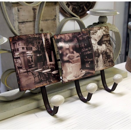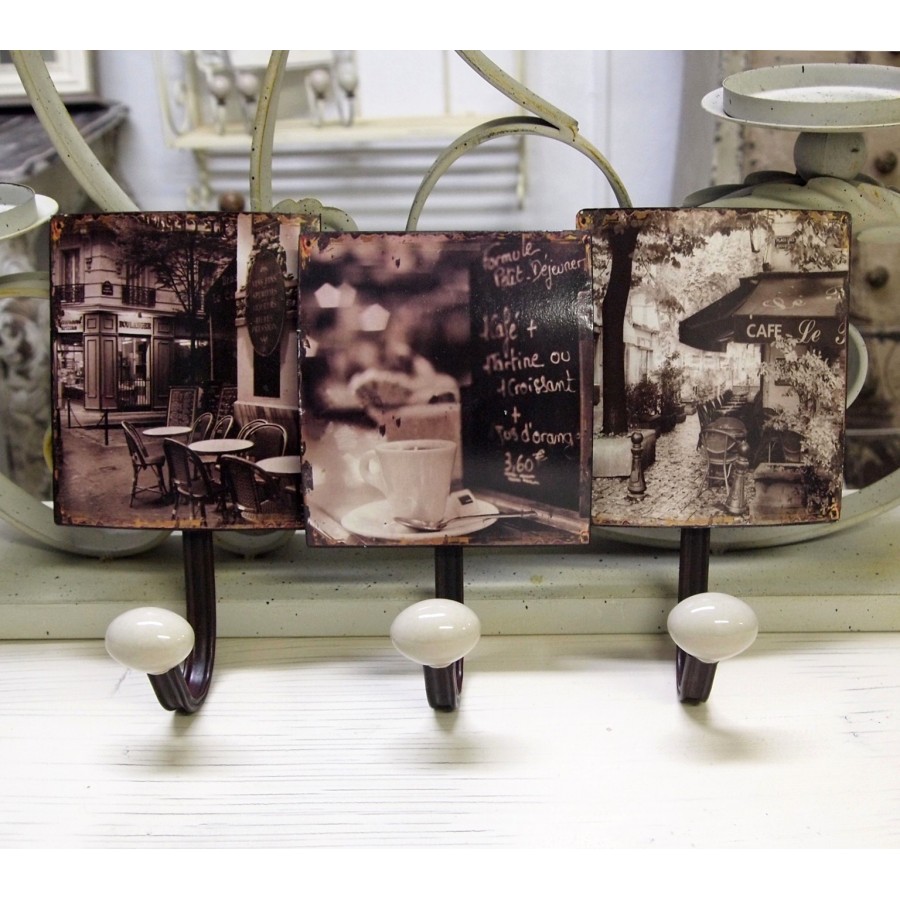 Urocze potrójne wieszaki ścienne Belldeco w stylu prowansalskim pochodzące z serii Retro, wykonane z metalu metodą decoupage.