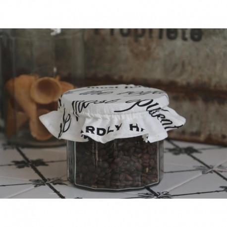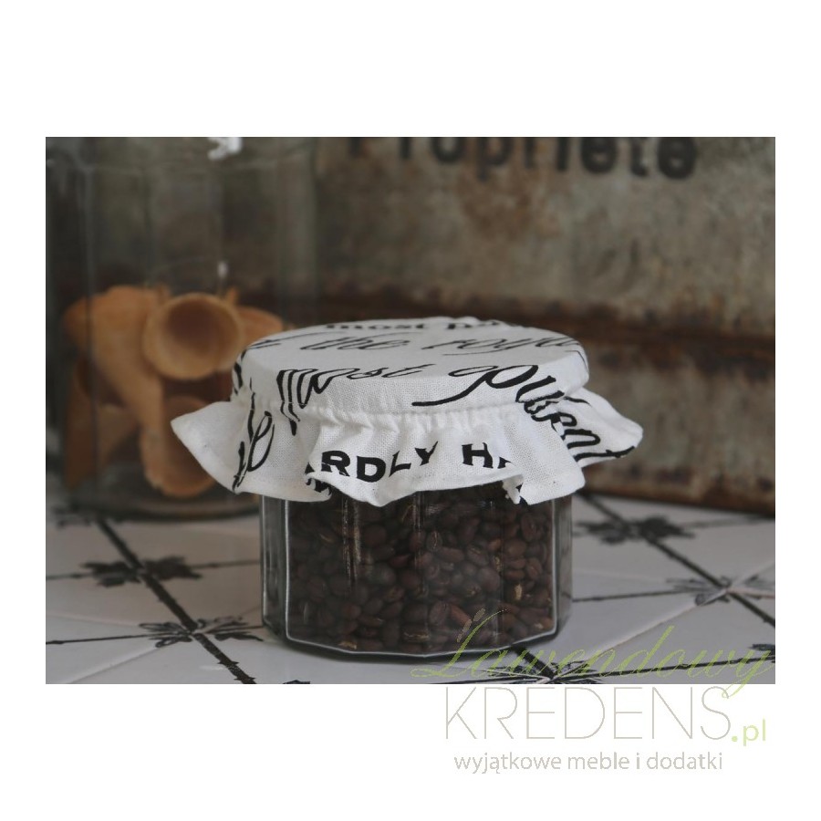 Bawełniany kapturek na słoik z czarnymi napisami.