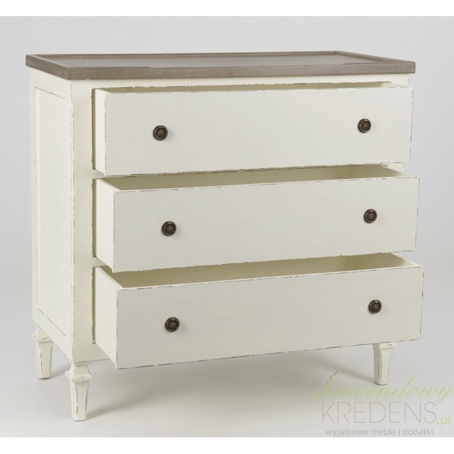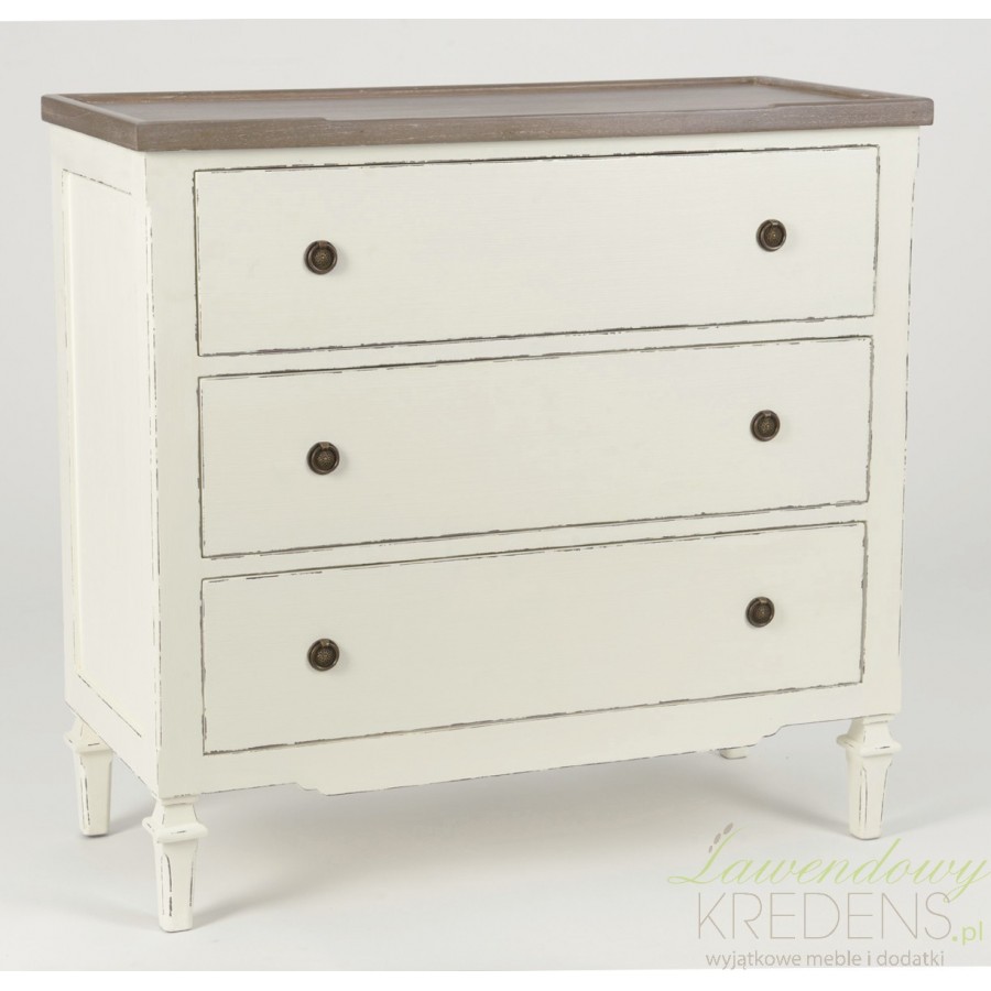 Szeroka i głęboka komoda prowansalska z trzema szufladami, uwieńczona blatem kolory naturalnego drewna!