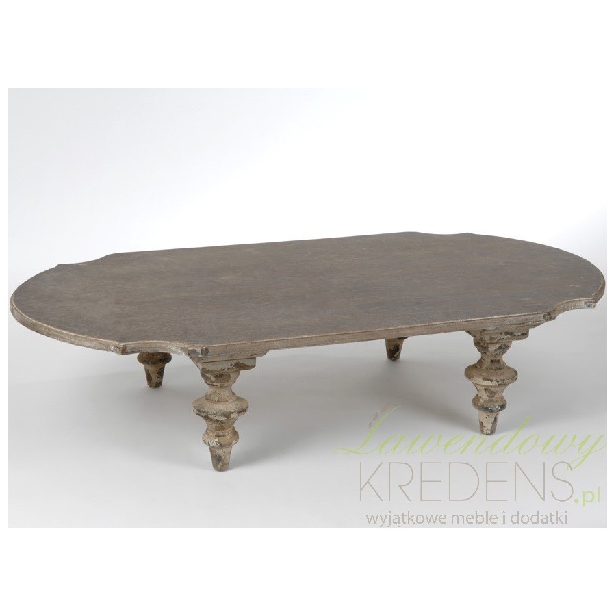 Wykonany z jodły niski, kawowy stolik prowansalski o prawie owalnym blacie na czterech solidnych nogach! Zapraszamy!