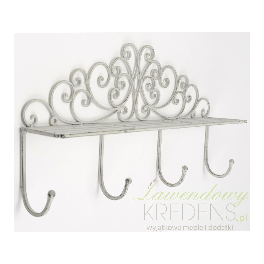 Wisząca półka z wieszakami to półka w stylu prowansalskim o metalowej konstrukcji w kolorze białym, której powierzchnia została celowo poprzecierana, aby uzyskać efekt postarzenia. Cztery wieszaki pod półką to wygodne miejsce na powieszenie płaszczy, kurtek czy kuchennych ręczników, w zależności od przeznaczenia półki!