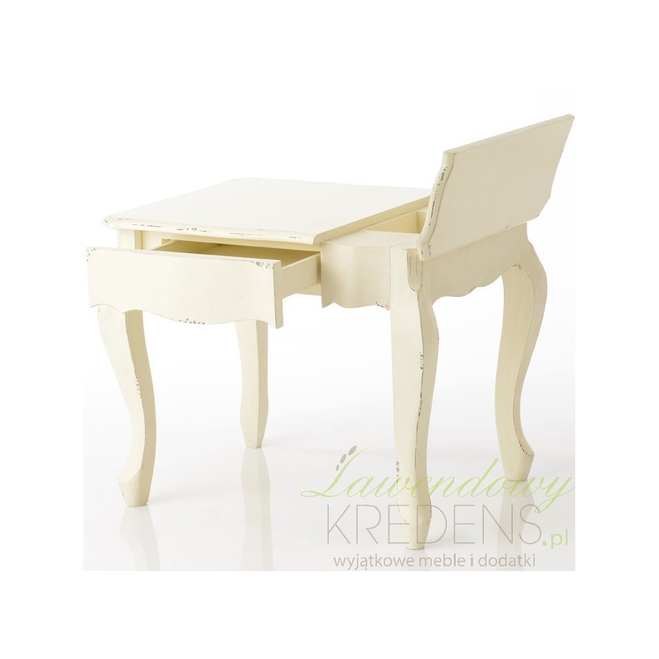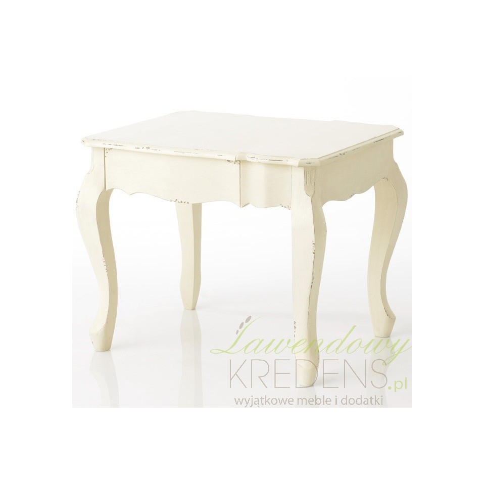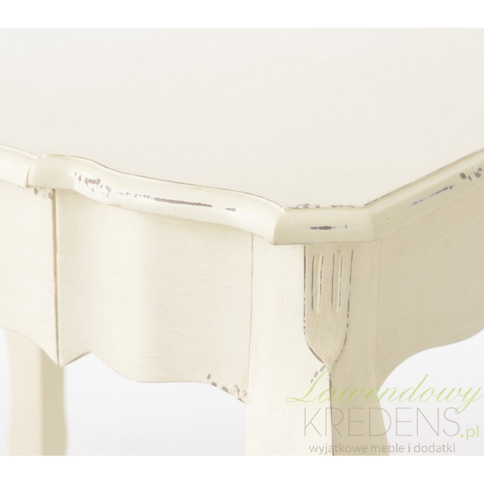 Stolik prowansalski o subtelnym ukształtowaniu czterech nóg i dolnych krawędzi pod blatem. Dzięki licznym przetarciom wygląda na mebel z przeszłością, co czyni specjalne postarzenia jeszcze bardziej aktrakcyjnymi. Nie sprawiając problemu podczas przenoszenia, stolik kawowy rewelacyjnie spisuje się w każdym pomieszczeniu!