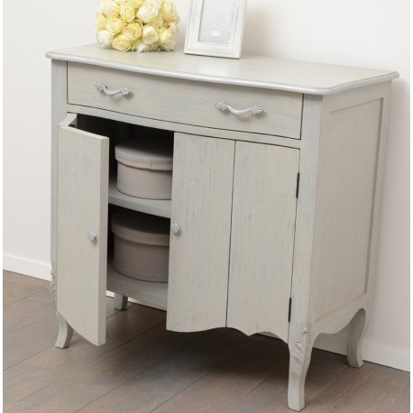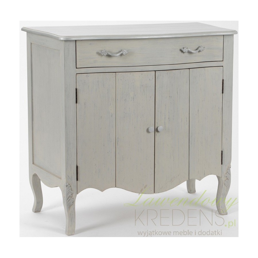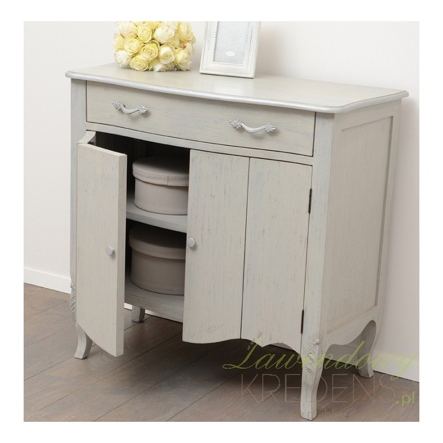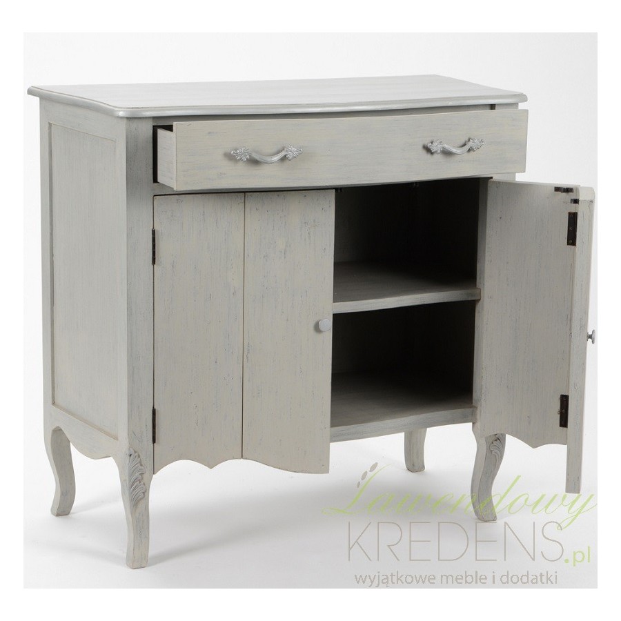 Zdobna i pojemna komoda prowansalska w kolorze szarym z dużą szufladą pod blatem i półkami zamykanymi podwójnymi drzwiami. Specjalnie wykończona powierzchnia z licznymi przetarciami przybliża prowansalski klimat słonecznej Prowansji. Oryginalne drzwi dwuskrzydłowe są dodatkowo skladane, co wizualnie sprawia wrażenie małej harmonijki!