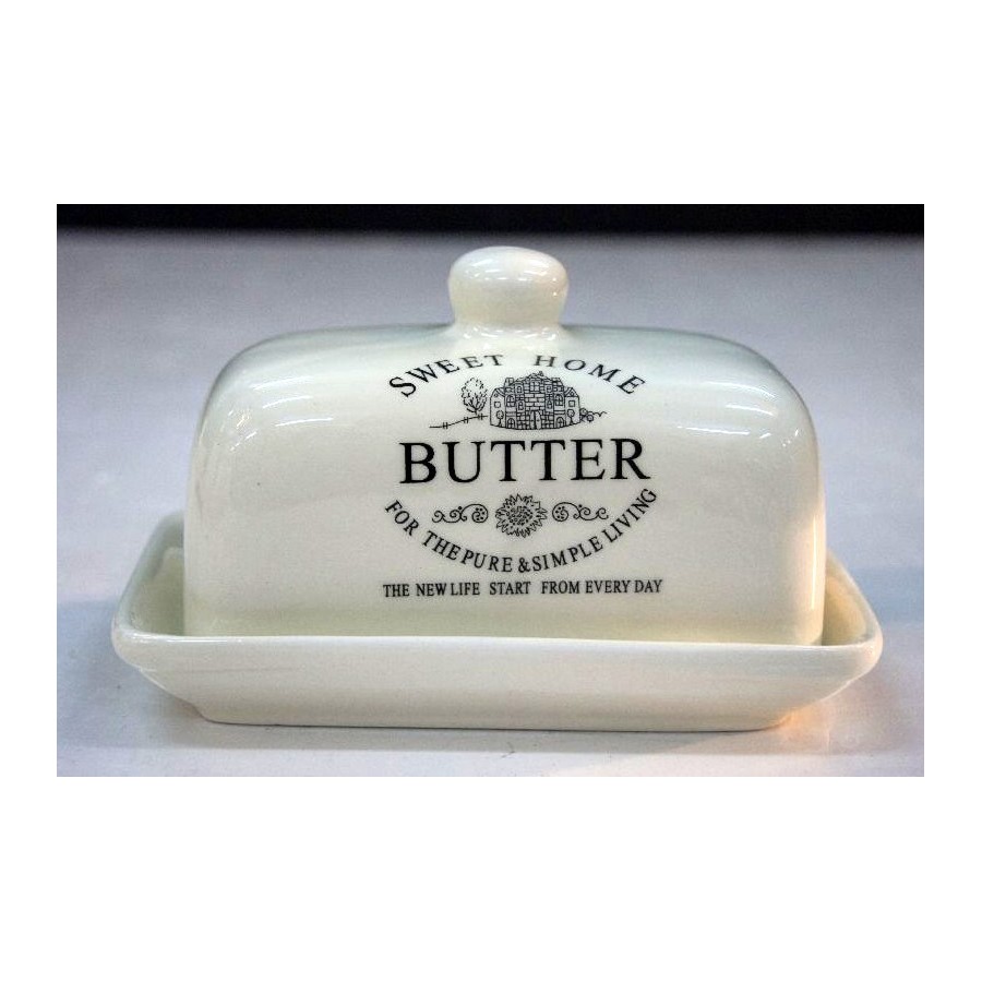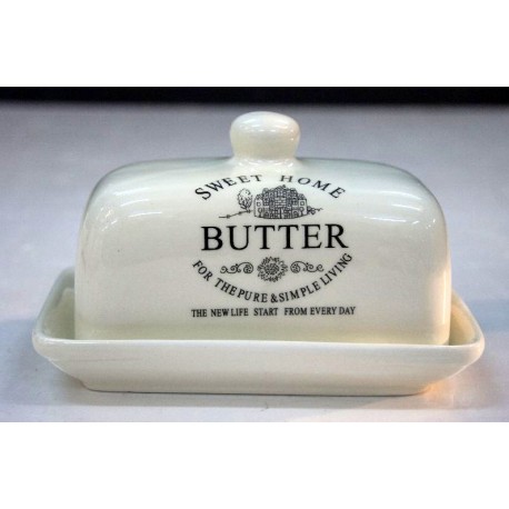 Kremowa, ceramiczna maselniczka SWEET HOME składająca się ze spodka oraz pokrywki ozdobionej czarnym wzorem.