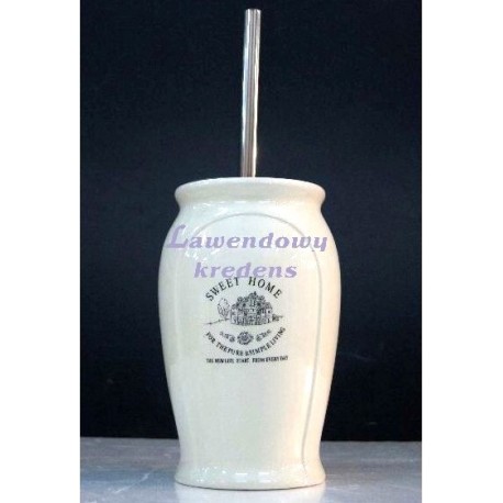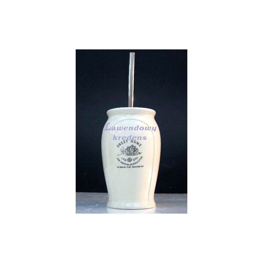 Szczotka do toalety wraz z ozdobnym, kremowym pojemnikiem SWEET HOME. Pojemnik wykonany jest z ceramiki, natimiast szczotka z plastiku. Ceramika SWEET HOME to seria uroczych dodatków do łazienki, polecamy Państwu także kuchenne dodatki SWEET HOME.