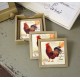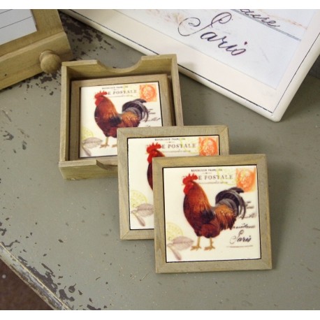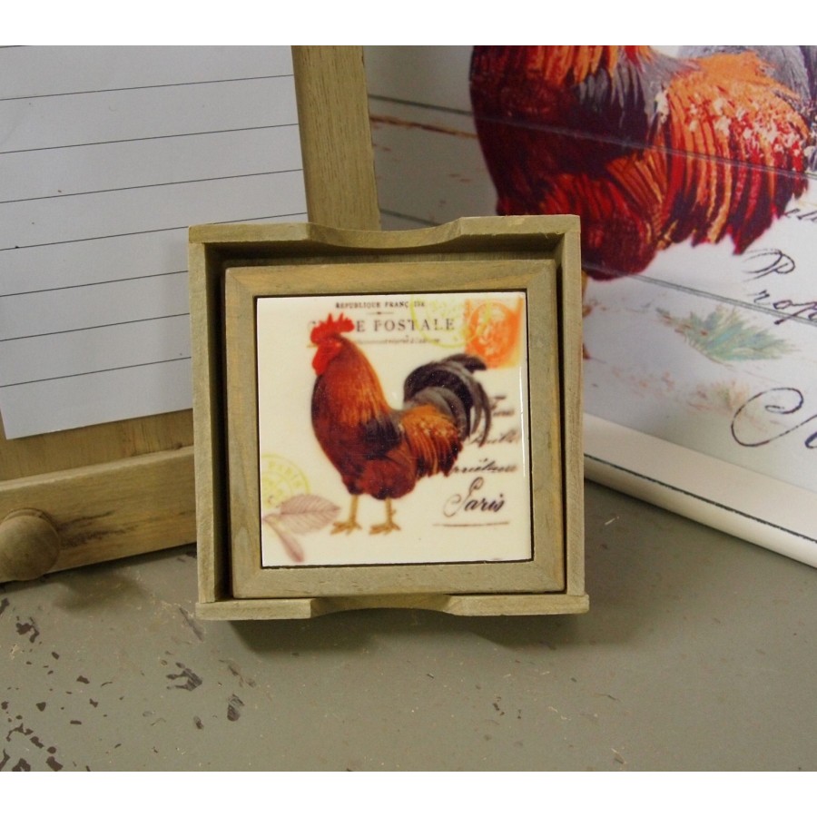 Cztery podkładki stołowe w stylu prowansalskim o wymiarach 9cm x 9cm wykonane z drewna oraz ceramicznych kafli z motywem koguta. Do podkładek dołączony jest drewniany pojemnik, do którego można włożyć podkładki.