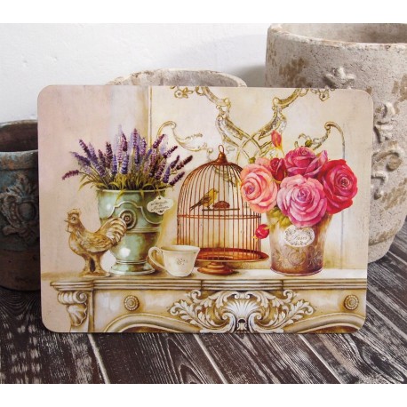 Urocze podkładki korkowe w stylu prowansalskim o kolorowym wzorze, na którym znajduje się między innymi lawenda, kwiaty róży oraz klatka z ptaszkiem. Dzięki kolorowemu zworowi podkładki będą stanowiły nie tylko ochronę dla stołu, ale także urocze dekoracje w stylu prowansalskim, które będą świetnie wyglądały w kuchni czy jadalni.