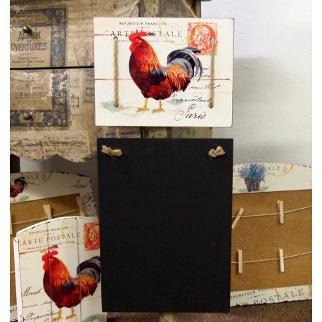 Niezwykle oryginalna tablica do pisania kredą w stylu prowansalskim składająca się z dwóch części: tablicy oraz drewnianej tabliczki w kolorze ecru, na której widnieje śliczny, prowansalski motyw koguta w żywych, pięknych kolorach. Tabliczka ta jest postarzana w stylu shabby chic poprzez imitacje zdarć farby wzdłuż krawędzi. Tablice są połączone ze sobą sznurkiem, który służy także to powieszenia tablicy. Tablica świetnie sprawdzi się na przykład w kuchni, jako miejsce do spisania zakupów czy rzeczy do zrobienia, albo w pokoju dziecka. Będzie także ciekawym pomysłem na prezent dla osoby lubiącej styl prowansalski.