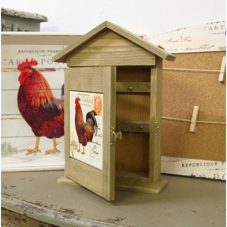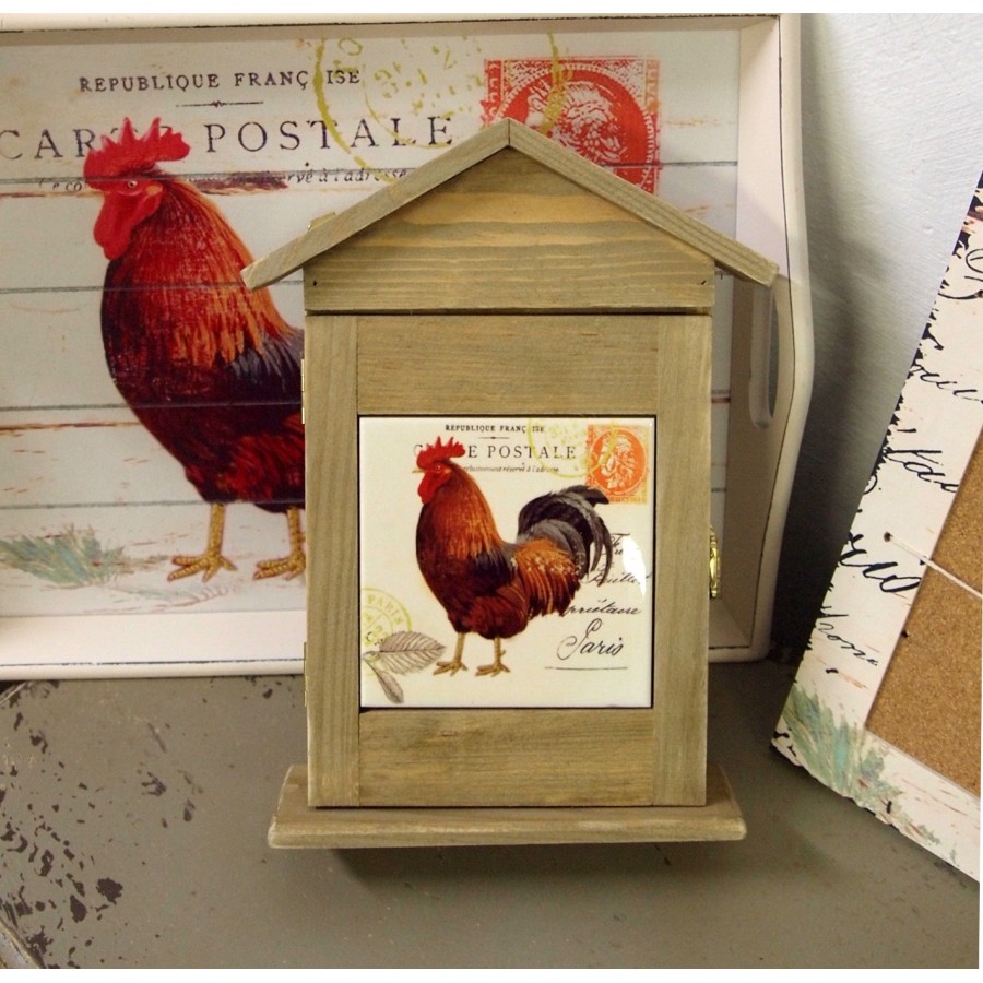 Drewniane szafki na klucze w stylu prowansalskim z dekoracyjnym kaflem, na którym znajduje się uroczy kogut oraz napisy w języku francuskim.