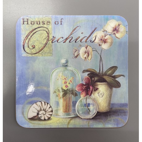 Prowansalskie, kwadratowe podkładki pod kubek lub filiżankę utrzymane w ciepłej tonacji kolorystycznej. Na podkładkach widnieje orchidea w doniczce oraz napis House of orchids. Wszystko na błękitnym tle. Podkładki korkowe oraz pozostałe prowansalskie dekoracje z naszego sklepu pomogą Ci stworzyć w Twoim domu niepowtarzalną atmosferę.