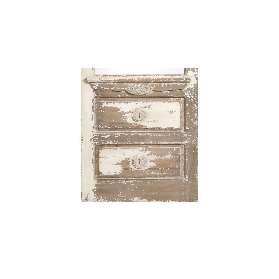 Bardzo efektowne, wysokie lustro Belldeco. Lustro Luna jest patynowane i celowo starzone w stylu shabby chic poprzez nieregularne przetarcia. W jego dolnej części znajduje się imitacja dwóch, otwieranych na kluczyk szuflad.