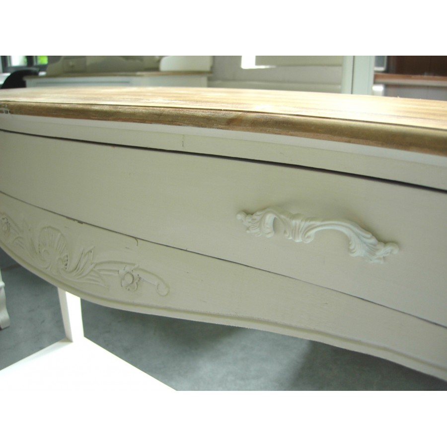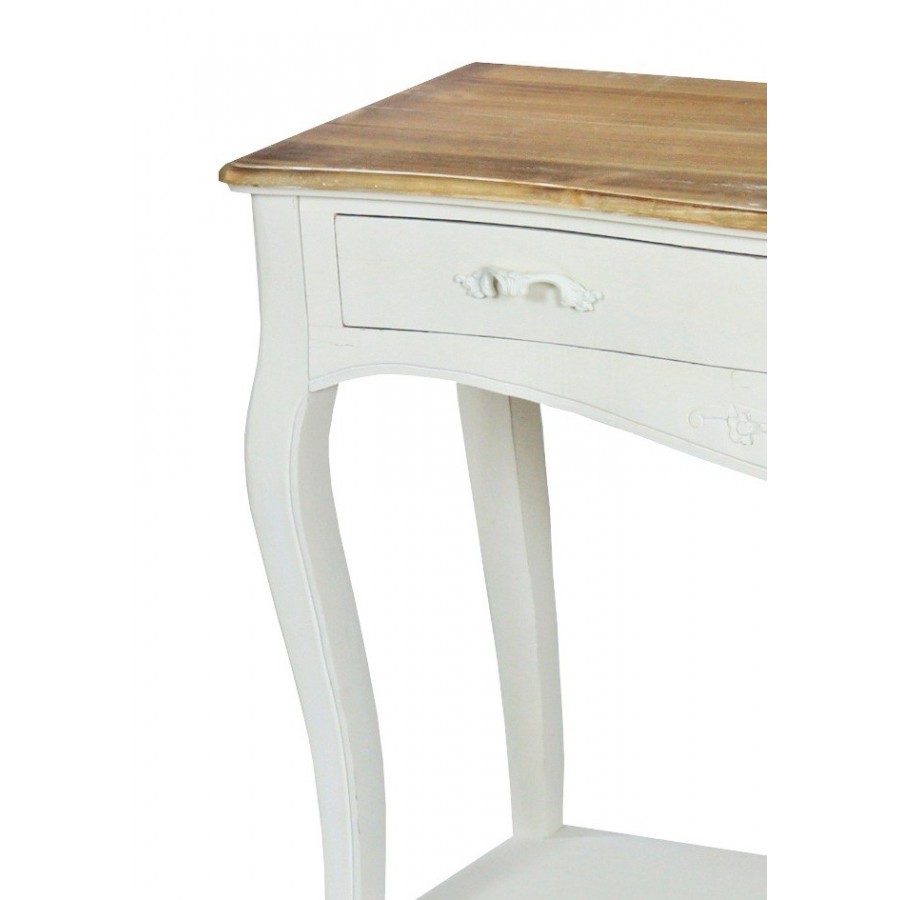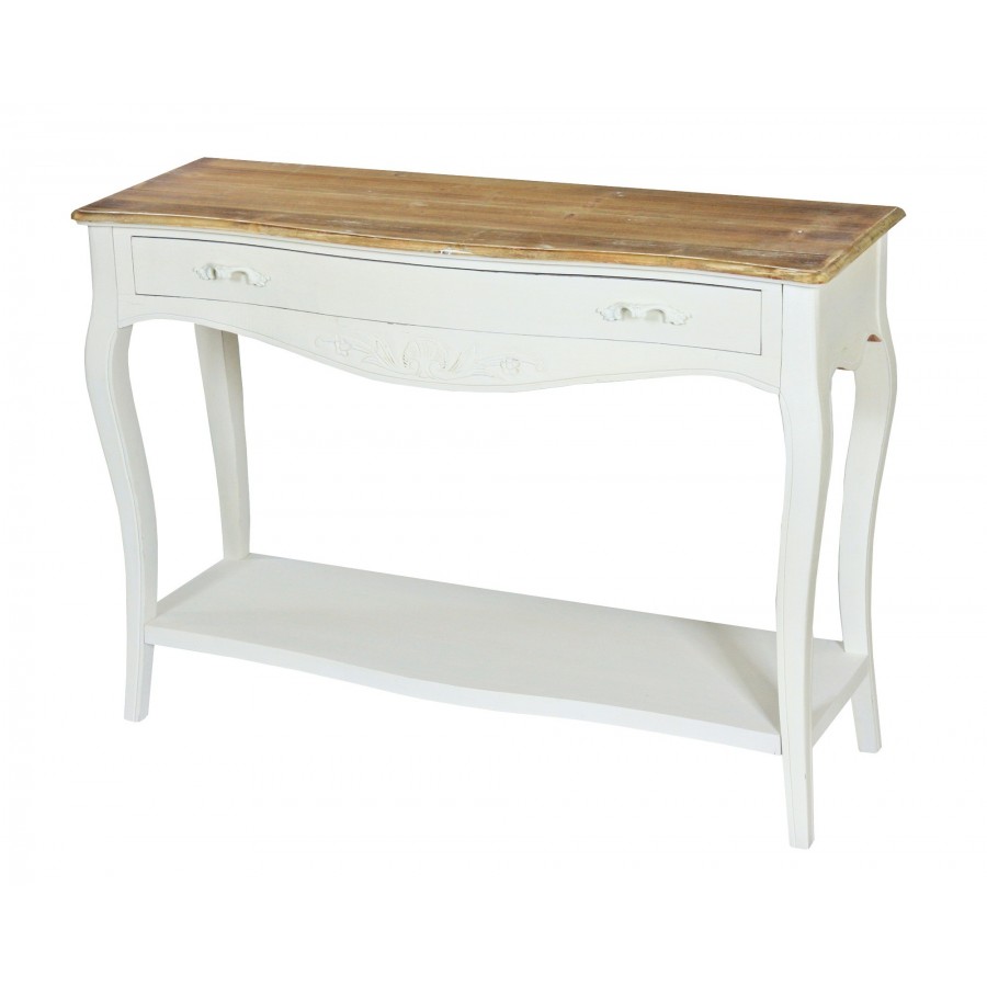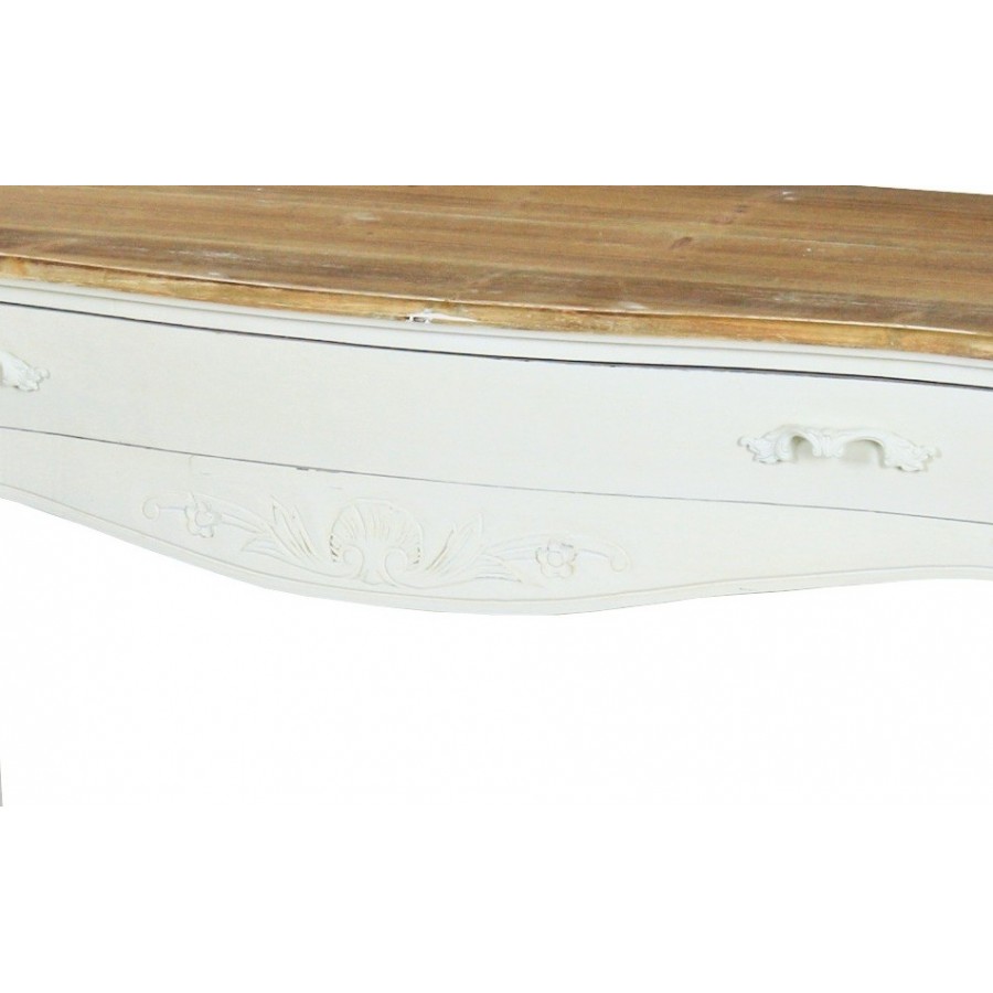 Celowo starzona techniką shabby chic konsola Romance w stylu prowansalskim. Konsola wykonana jest z drewna jodłowego, a na jej powierzchni w jasnym kolorze ecru znajdują się przetarcia farby, odsłaniające brązowy kolor. Blat konsoli ma naturalny, brązowy kolor drewna a jego powierzchnia jest bielona, co oznacza, że znajdują się na niej celowe, nieregularne przetarcia białą farbą. Nogi konsoli mają elegancki, zaokrąglony kształt, a uchwyty za które otwierane są szuflady są ciekawie rzeźbione. Na froncie konsoli znajduje się przepiękne, ręcznie wykonane rzeźbienie. Dzięki znajdującej się w dolnej części konsoli półce, jest to mebel nie tylko dobrze prezentujący się, ale także praktyczny i funkcjonalny. Na życzenie Klienta chętnie doślemy więcej zdjęć konsoli.