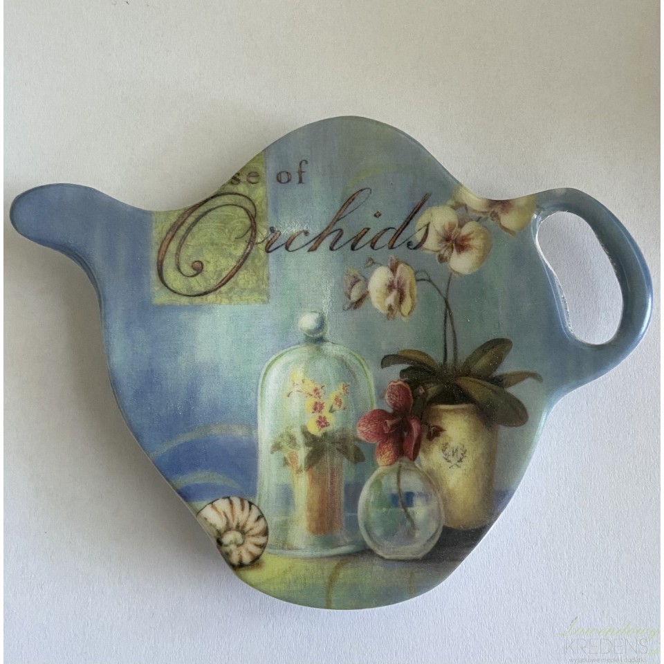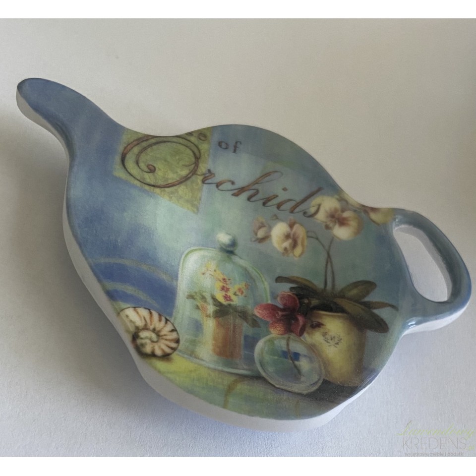 Prowansalskie podkładki stołowe, które służą do podania torebki herbaty oraz odłożenia łyczeczki czy zużytej torebki herbaty. Podkładki wykonane są z plastiku i znajduje się na nich orchidea oraz napis Orchids na błękitnym tle. Motyw kwiatu orchidei świetnie prezentuje się na niebieskim, przetartym tle.