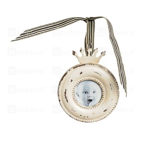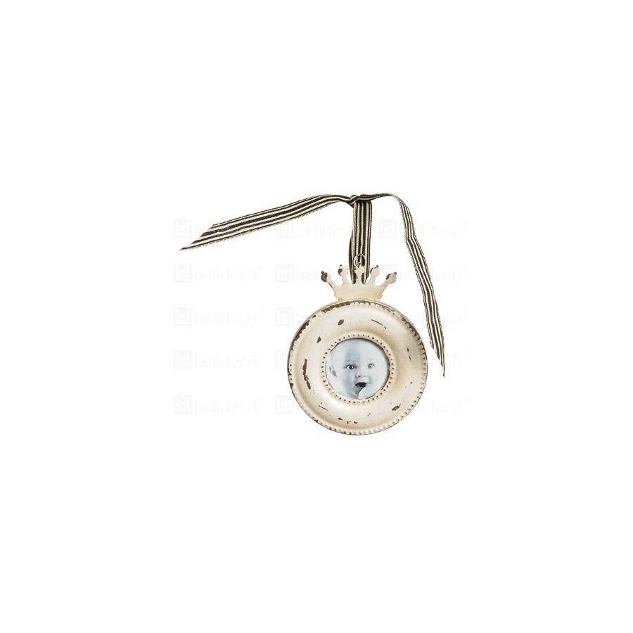 Urocza, okrągła ramka na zdjęcie Belldeco do zawieszenia na wstążce. Ramka ma kremowy kolor, na którym widoczne są ciemne przetarcia.