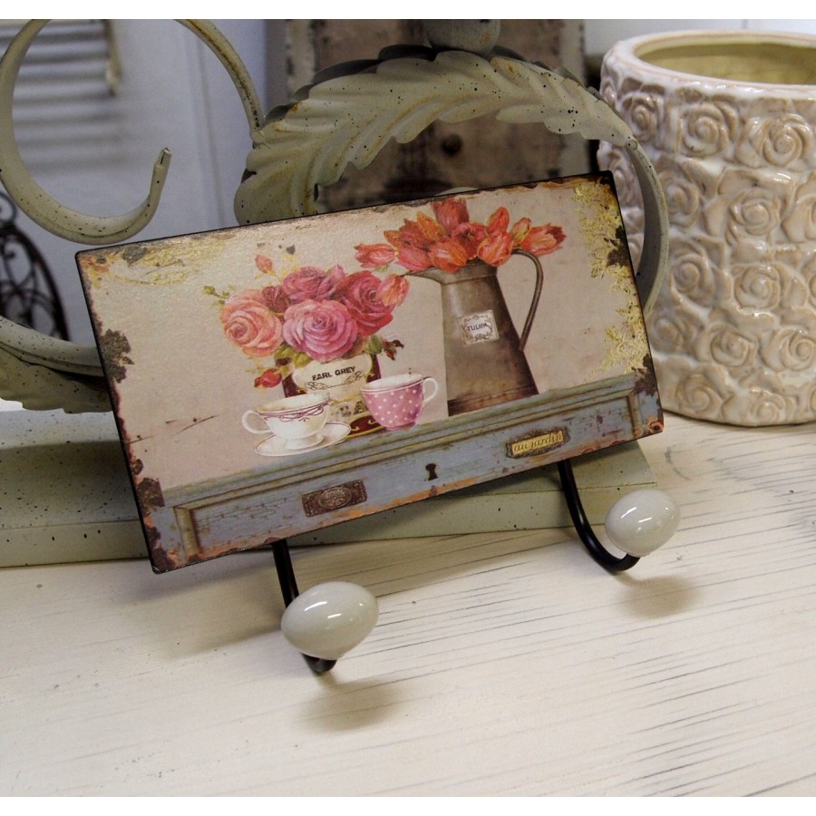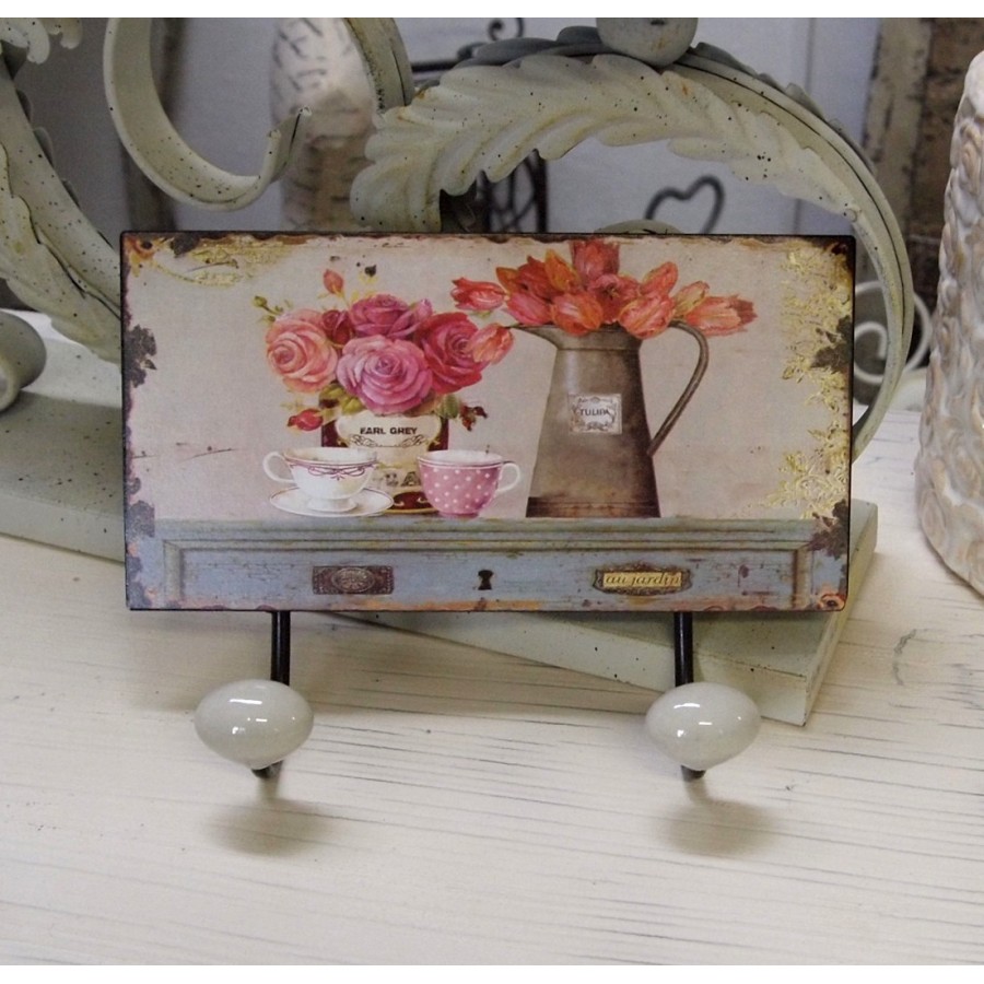 Stylowo postarzane, prowansalskie wieszaki ścienne wykonane z metalu. Wieszaki mają po dwa wieszaczki, dzięki czemu świetnie sprawdzą się w kuchni, łazience jak i w przedpokoju. Na wieszakach znajduje się przepiękny wzór w stylu prowansalskim, na którym znajduje się bukiet róż, bukiet tulipanów oraz dwie filiżanki stojące na starej, prowansalskiej komodzie.