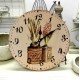 Piękne, okrągłe zegary ścienne w stylu prowansalskim, na których znajdują się czerwone hiacynty zasadzone w metalowych puszkach.