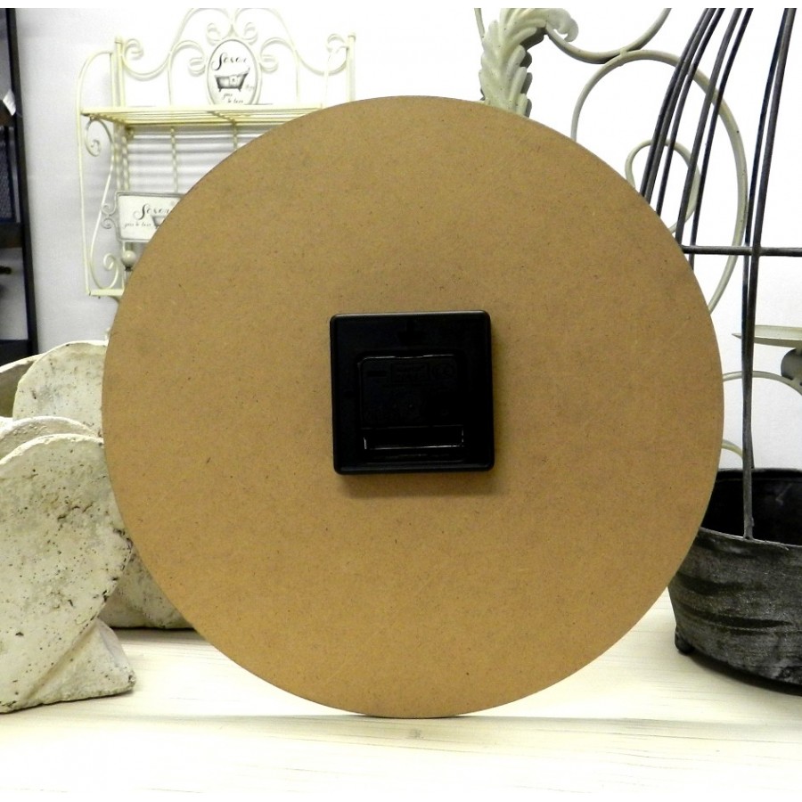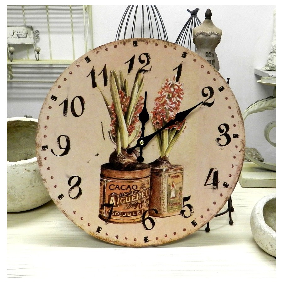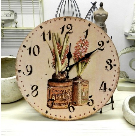 Zegar prowansalski o średnicy 34cm z hiacyntami zasadzonymi w metalowych puszkach. Czarne cyfry wskazujące godziny są stylowo przecierane, a przy kwawędziach zegara znajdują się ciemniejsze przecierki. Do zegara można dobrać inne prowansalskie dodatki z tym samym lub podobnym wzorem, czyli obrazki ścienne, wieszaki oraz podkładki korkowe.