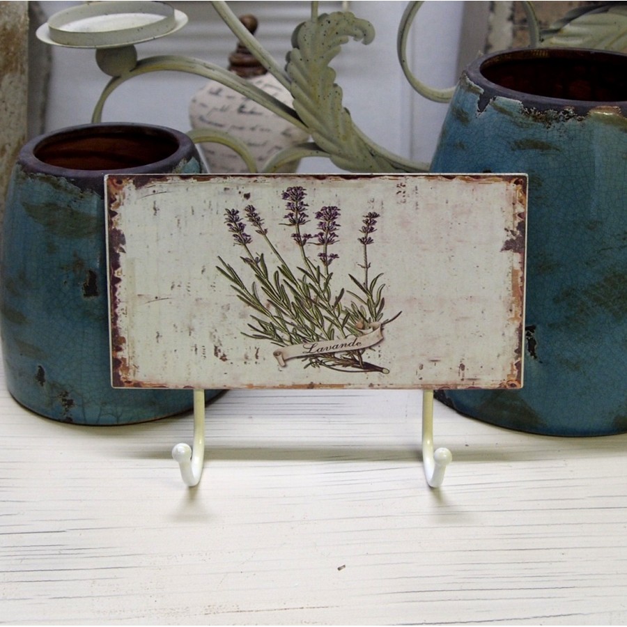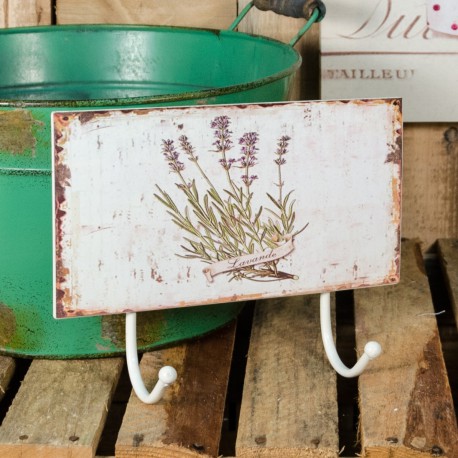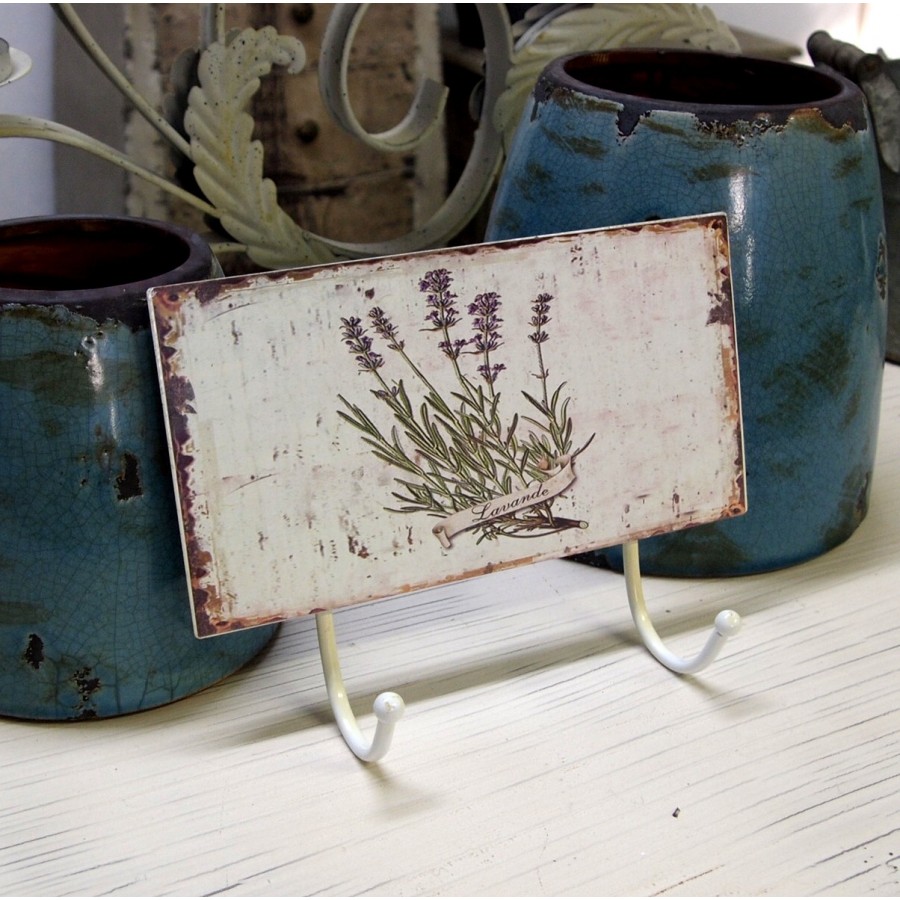 Wieszak w stylu prowansalskim z dwoma wieszaczkami oraz tabliczką zdobioną nadrukiem przedstawiającym lawendę. Wieszak jest produktem idealnym dla każdego miłośnika Prowansji, można do niego dobrać inne przedmioty z motywem lawendy, jak na przykład zegary ścienne lub obrazy w stylu prowansalskim.