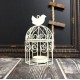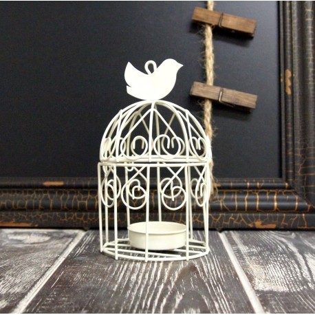 Cudowny świecznik w kształcie ozdobnej, białej klatki z wizerunkiem ptaszka, siedzącego na jej szczycie.