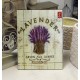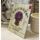 Urocze, metalowe obrazki z lawendą, napisem Lavender, czerwonym znaczkiem oraz dwoma pieczątkami.