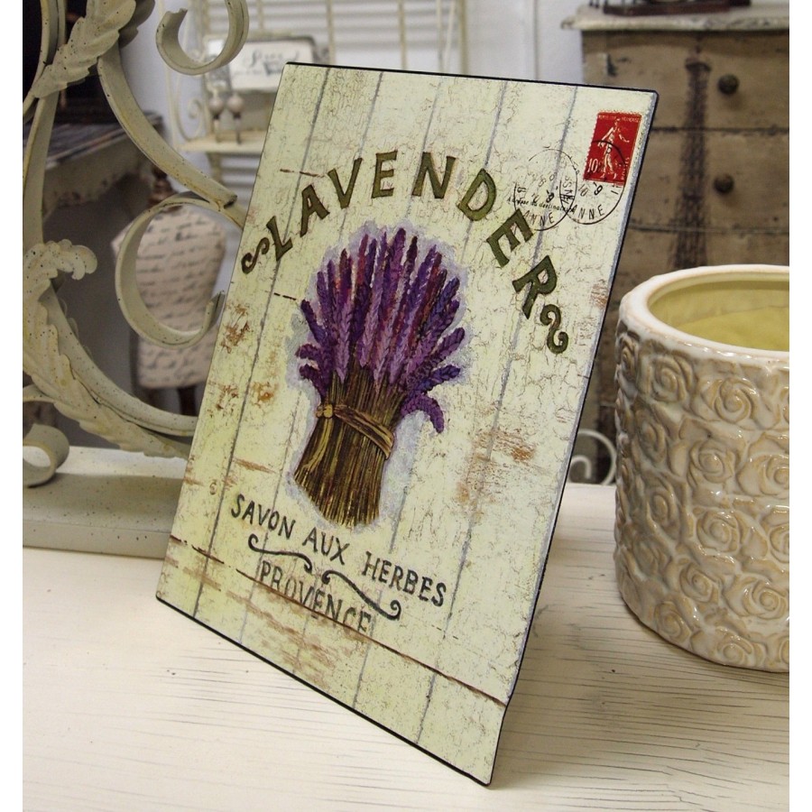 Śliczne obrazy w stylu prowansalskim z metalu, wykonane techniką decoupage. Na obrazkach widnieje lawenda, francuskie napisy, dwa stemple oraz czerwona pieczątka. Metalowe obrazki będą pełnymi uroku dekoracjami ściennymi, idealnymi dla wszystkich osób, które lubią styl prowansalski.