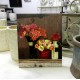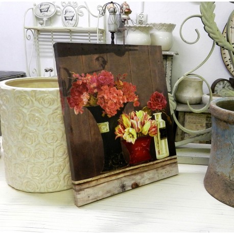 Urokliwe obrazki prowansalskie przedstawiające różne kwiaty stojące na komodzie na brązowym tle. Rama obrazu wykonana jest z drewna sosnowego.