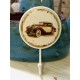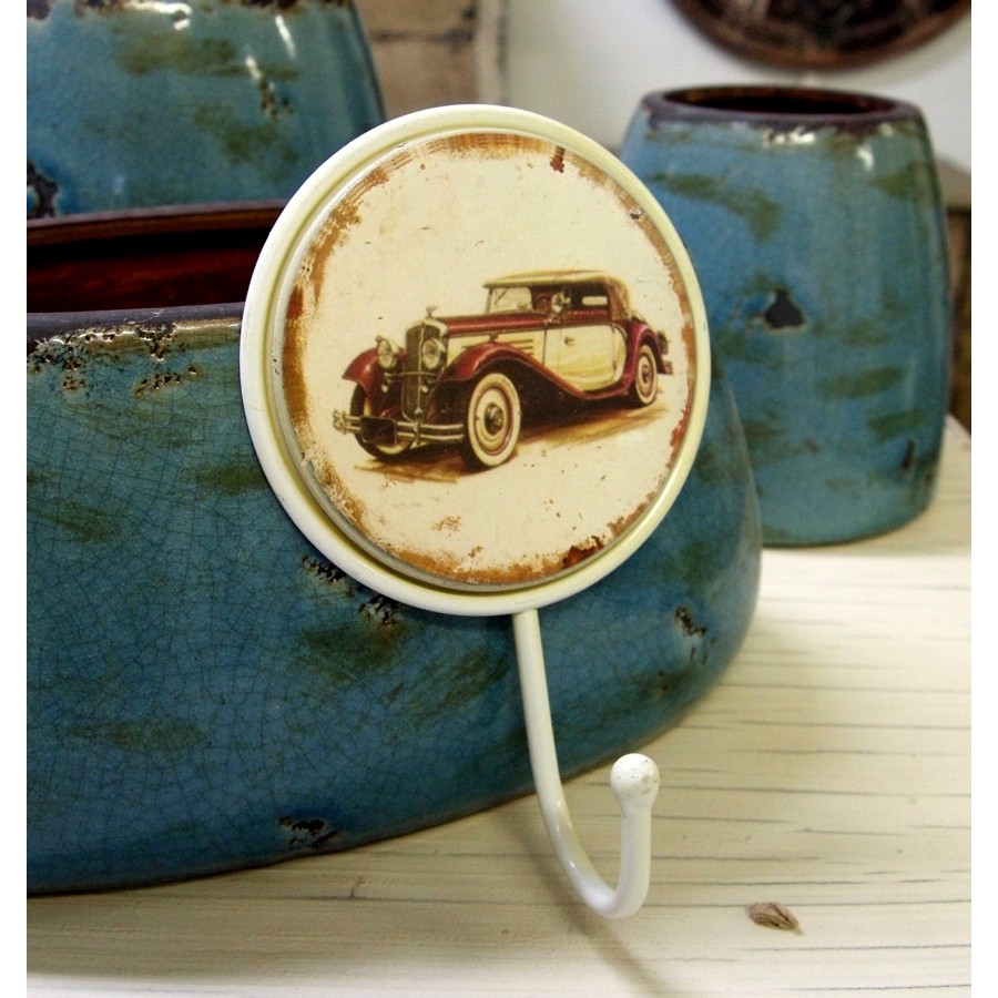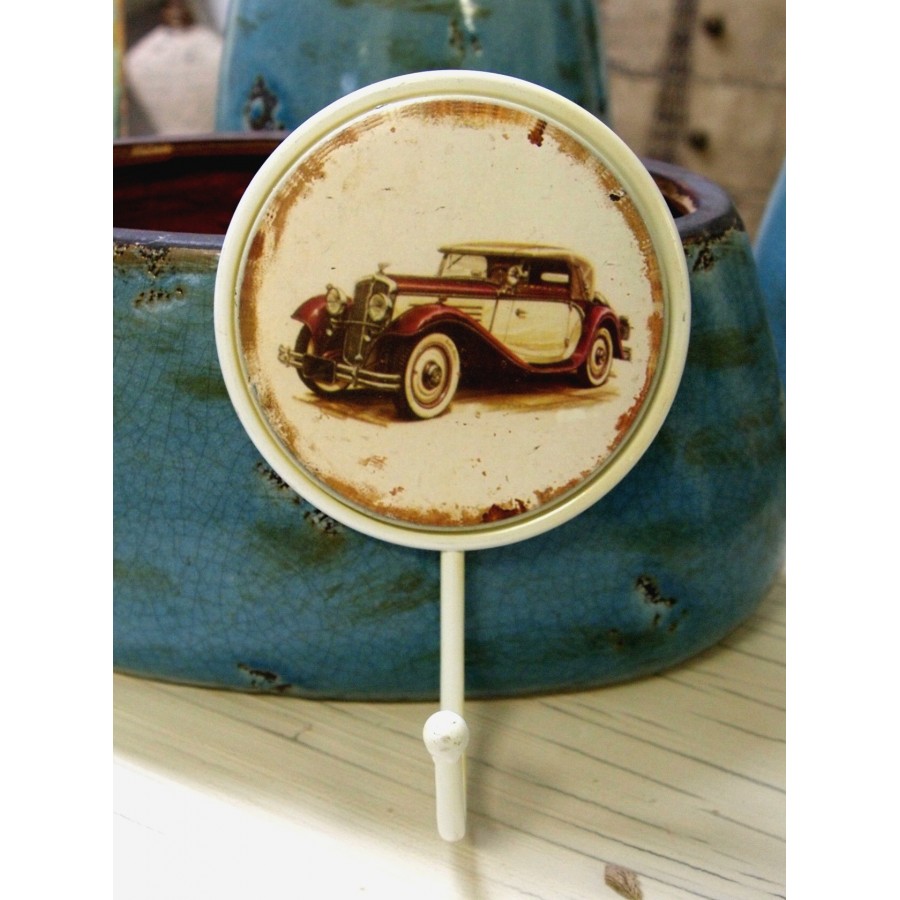 Jasne, okrągłe wieszaki ścienne wykonane z metalu z zabytkowym autem. Wieszaki idealne do pokoju dziecka.