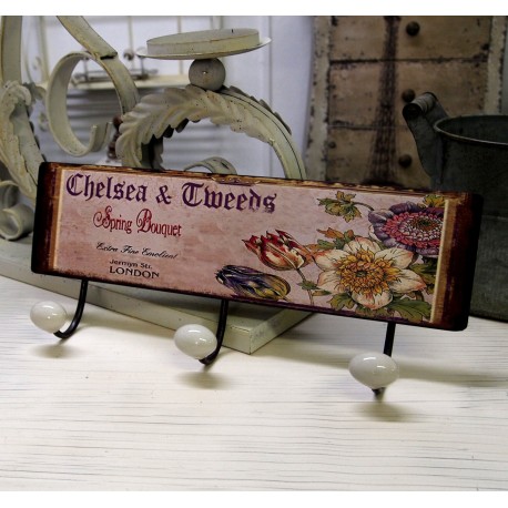 Potrójne wieszaki ścienne w stylu prowansalskim wykonane z matalu. Na wieszakach znajdują się kwiatowe wzory oraz angielskie napisy.