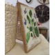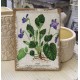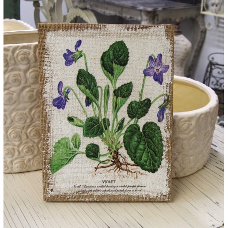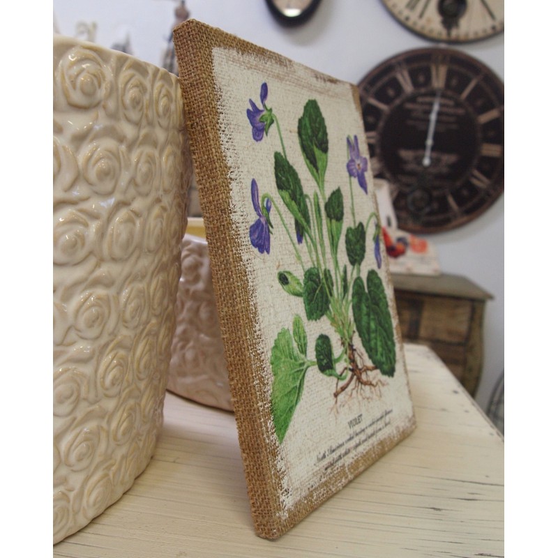 Ozdobne, prostokątne obrazki ścienne Belldeco Garden Green z kwiatami fiołka namalowanymi na białym tle na tkaninie jutowej.