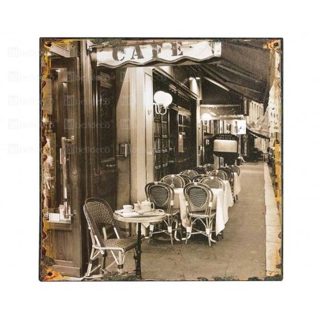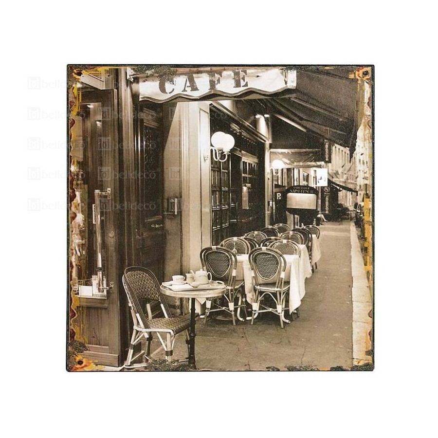 Retro Obrazek Kafejka to uroczy, kwadratowy obrazek Belldeco wykonany z metalu techniką decoupage, na którym przeważa brązowo-szara kolorystyka.