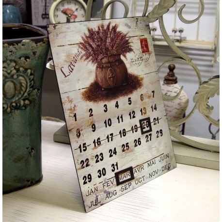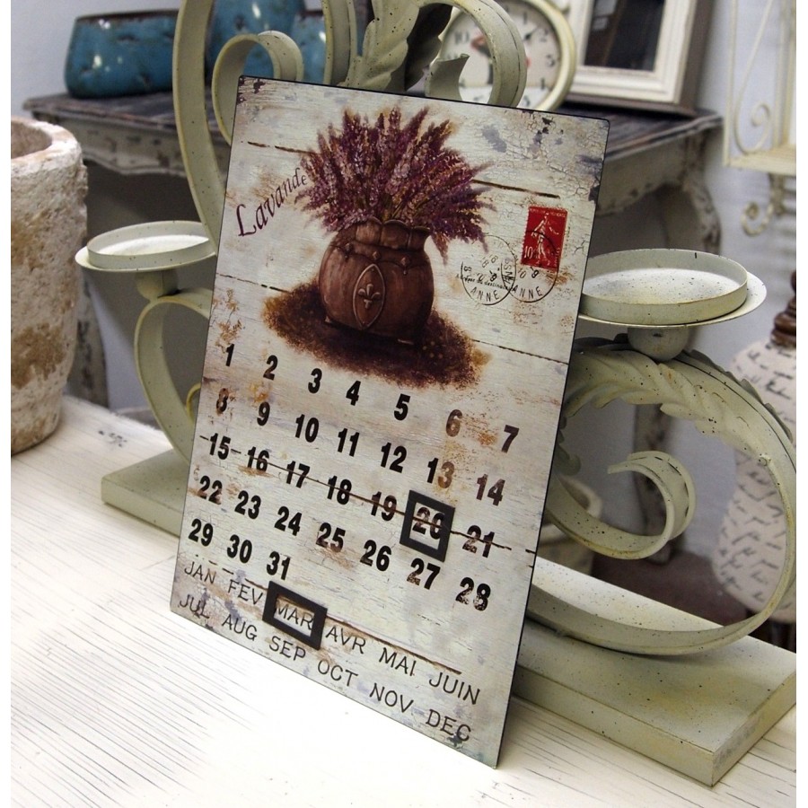 Pełen uroku, prowansalski kalendarz z lawendą wykonany z metalu. Na kalendarzu oprócz lawendy znajdują się dwie czarne pieczątki, czerwony znaczek oraz napis Lavande. Dni oraz miesiące znajdujące się w dolnej części kalendarza można zaznaczać za pomocą magnetycznych, czarnych ramek. Kalendarze z lawendą to prowansalskie dekoracje, które przydadzą się zarówno w kuchni, sypialni i pokoju dziecka jak i w biurze. Do kalendarzy polecamy inne dodatki i dekoracje w stylu prowansalskim takie jak zegary ścienne, podkładki stołowe, zegary w kształcie budzików oraz wieszaki ścienne.