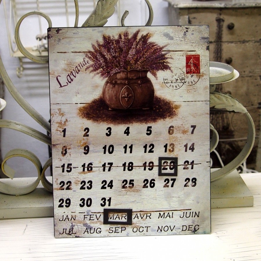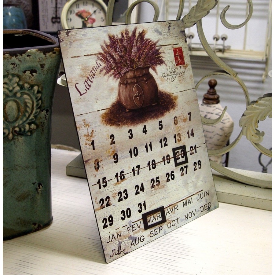 Prowansalski kalendarz z lawendą, napisem lavande, dwoma pieczątkami i czerwonym znaczkiem pocztowym. Kalendarz wykonany jest z metalu.